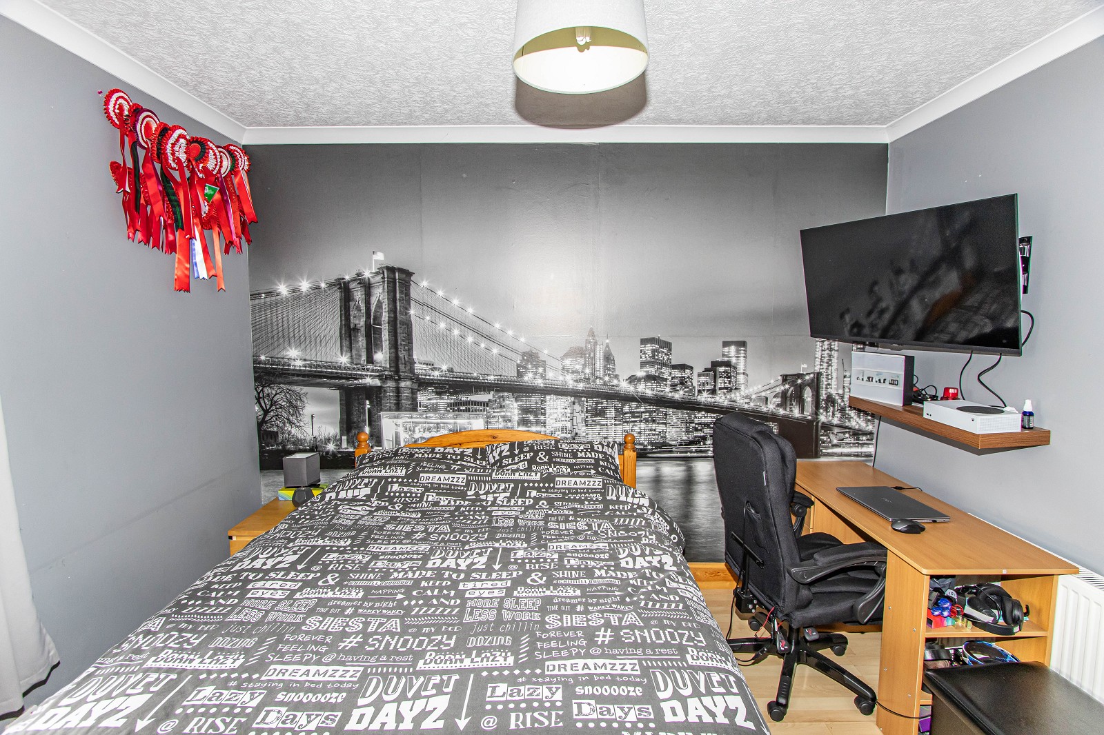 This double room, situated to the rear of this wonderful home features a mural wall and beech laminate flooring. There is coving, a pendant light fitting and a central heating radiator. There is also a built-in wardrobe with hanging and shelf space. A window can be found to the rear elevation.