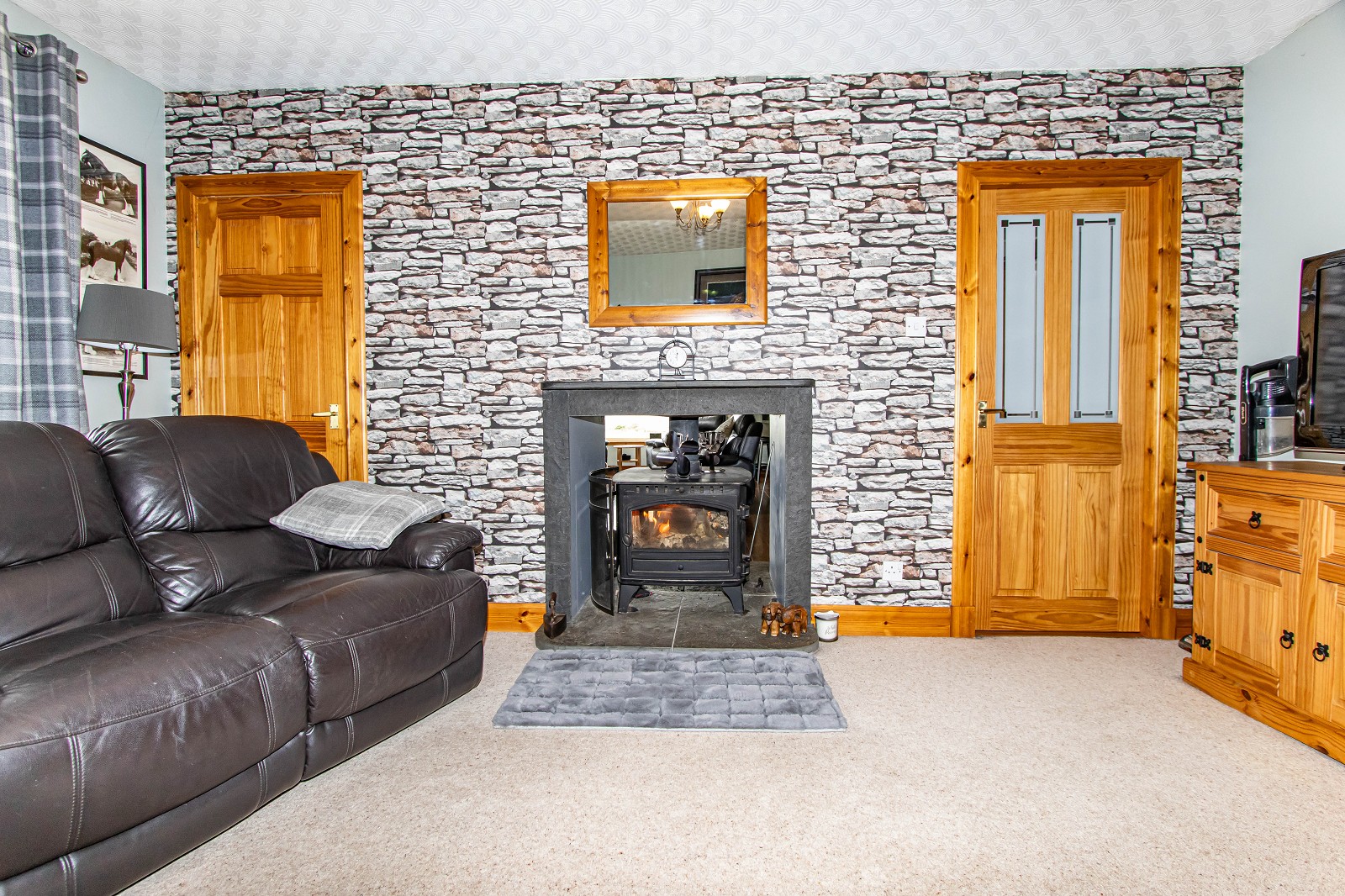 This cosy lounge has a feature papered wall as well as a Caithness flagstone fireplace and hearth with a double-sided Hunter Herald 17 kw multi fuel stove. A carpet has been laid to the floor; there is triple light fitting and central heating radiator. A window faces the front elevation and there is also a built-in cupboard. This room also benefits from a telephone point and has a lovely window seat with additional storage underneath. A door leads to the superb kitchen/family room.