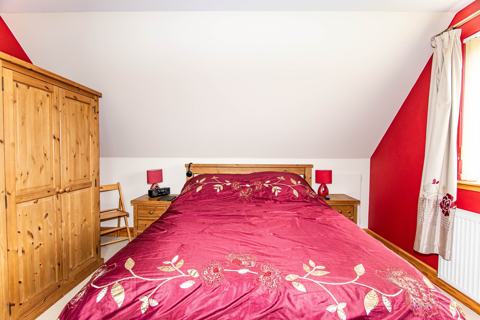 This beautiful room has a feature painted wall as well as a cream fitted carpet. There are two velux windows with black out blinds and a further fire escape window to the side elevation. There is a central heating radiator, ceiling downlighters as well as storage space in the eaves.