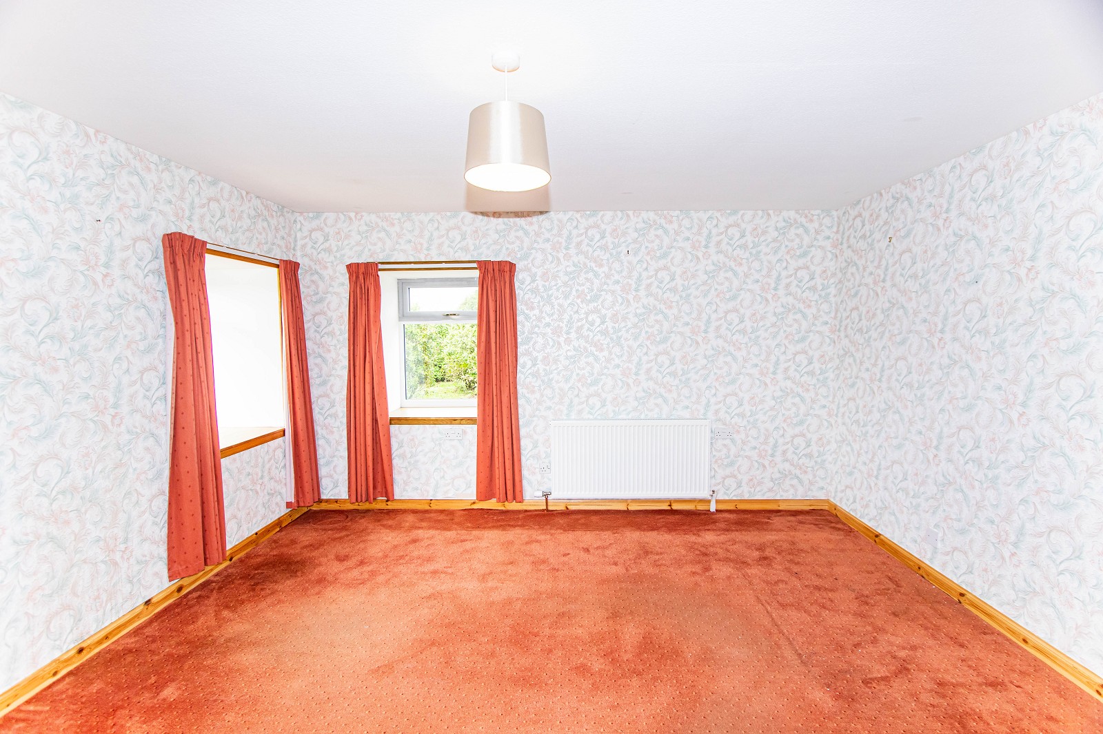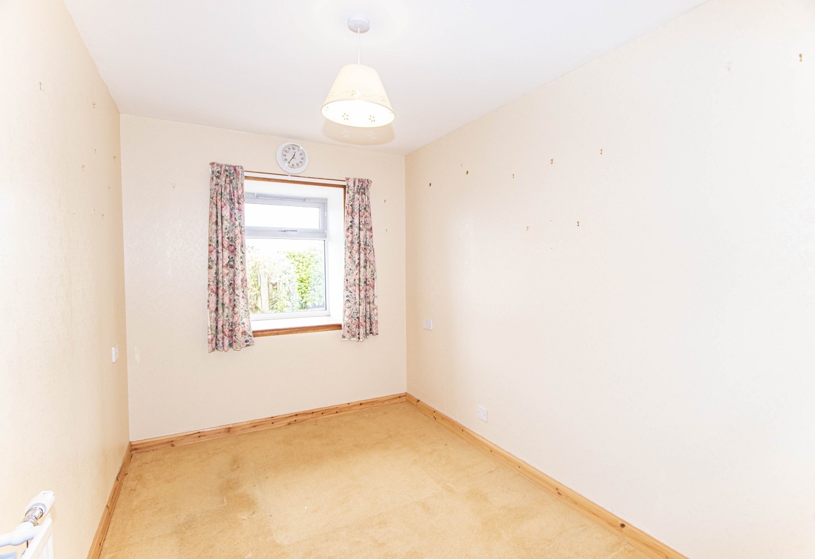This lovely room is neutral in décor and benefits from white painted walls and solid wooden flooring. There is an electric panel heater, a pendant light fitting and double sockets. A window with curtains faces the rear elevation.