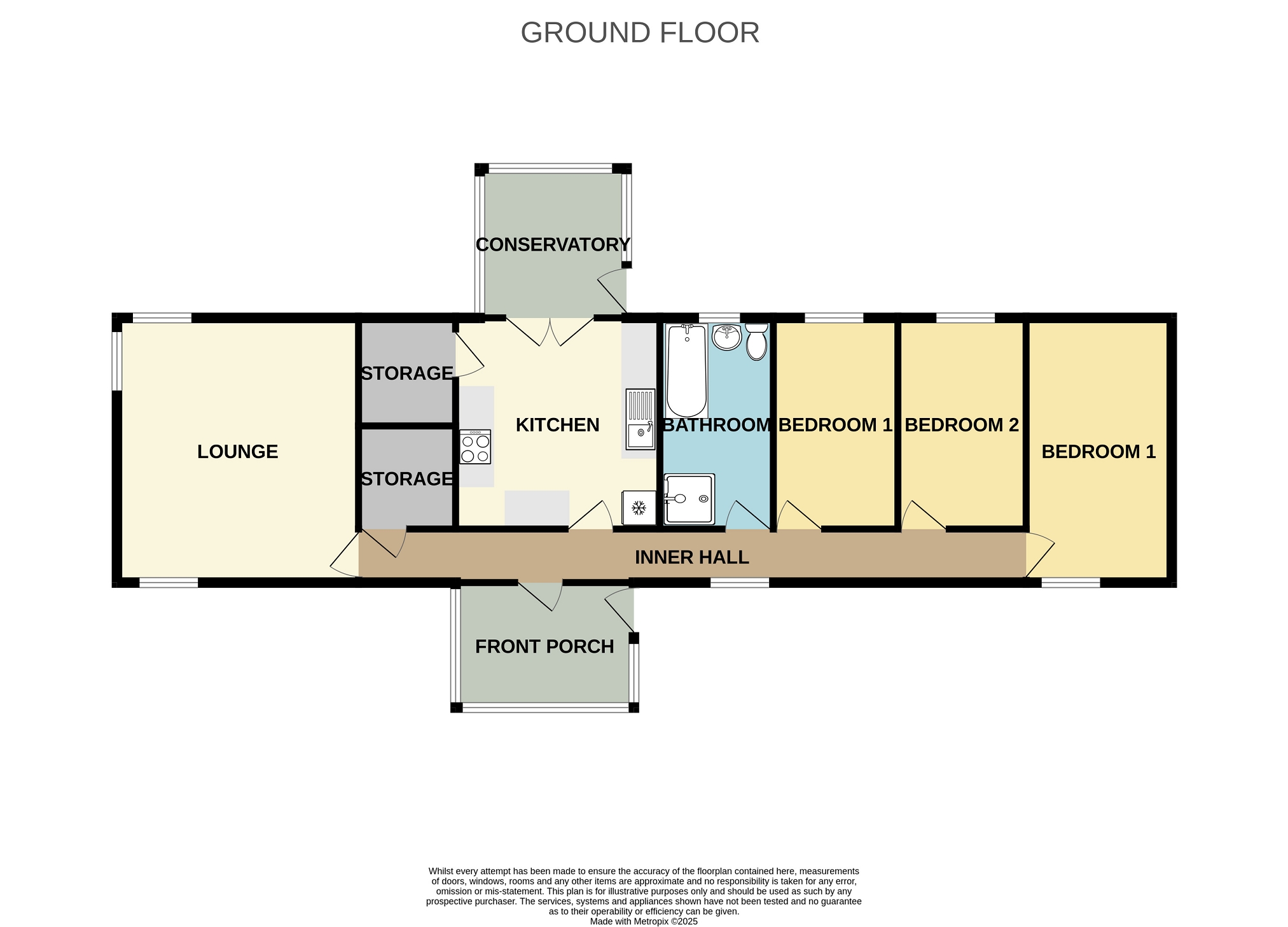 The inner hall is neutral in décor. The walls have been papered, there are three pendant light fittings and a carpet has been laid to the floor. A window faces the front elevation and there are two central heating radiators. Pine doors give access to the lounge, kitchen, front porch, two bedrooms and bathroom.