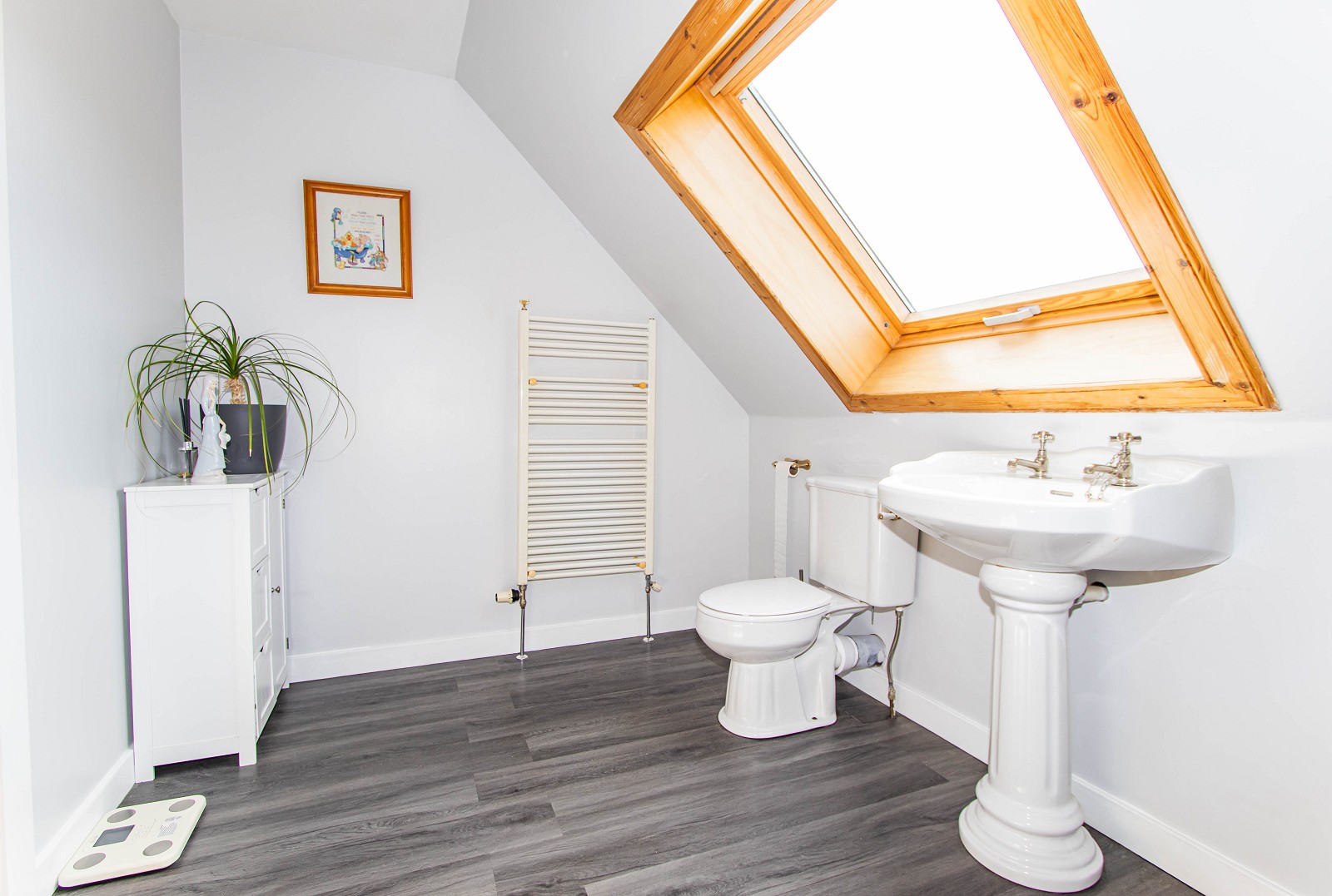 This room is bright with a shower quadrant with chrome controls, within the enclosure has been tiled. There is a white WC, a pedestal sink as well as a central heating radiator. Grey vinyl has been laid to the floor, there is a wall mounted cupboard, an extractor fan as well as a pendant light fitting. It also benefits from a velux window.