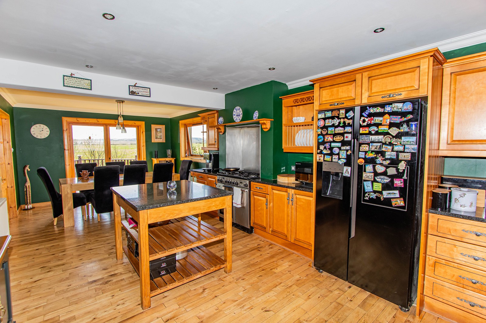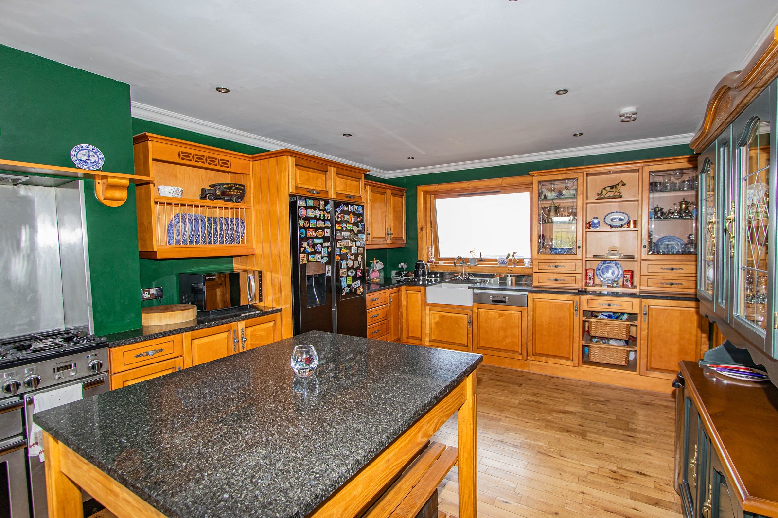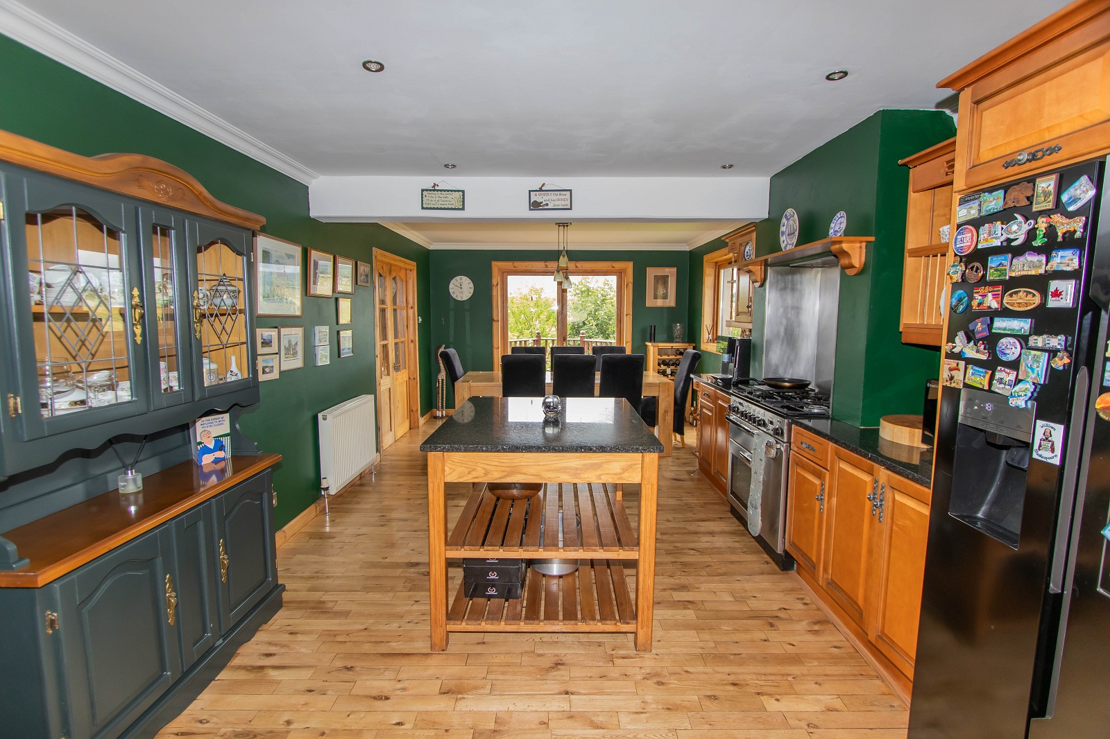This superbly presented five-bedroom detached property offers spacious and flexible family living across two floors. The home is entered via a welcoming vestibule leading to a bright and expansive inner hall with ample storage. The generous lounge features a multi-fuel stove with a carved wooden surround and patio doors opens onto a raised deck area, ideal for entertaining. A country-style kitchen/dining room is the heart of the home, boasting ash units, a Range Master cooker, Belfast sink, and granite-topped island, with french doors connecting to the garden. A family room, utility, two ground-floor bedrooms, and a stylish shower room complete the lower level. Upstairs, the master suite benefits from a walk-in dressing room and en-suite shower room, with two further well-proportioned bedrooms and a stylish bathroom with a freestanding bath.
