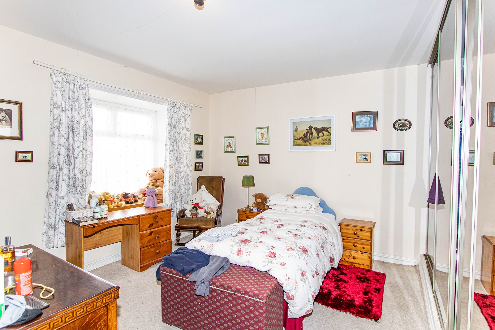 This bright room has a painted feature wall and benefits from a beige fitted carpet. There is a drop-down light fitting, an access hatch to the loft void as well as a window to the front elevation. This room also benefits from a central heating radiator.