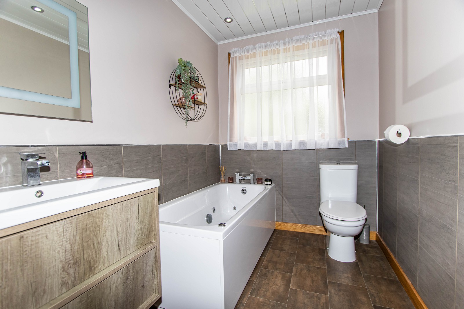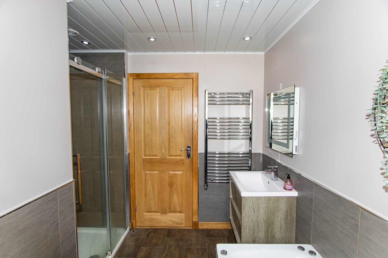 The stunning bathroom benefits from a bath, a WC and a basin which has been built in to a vanity unit. The walls have been partially fitted with wet wall and vinyl has been laid to the floor. There is a chrome towel ladder radiator, a wall mounted mirror and ceiling downlighters. A window can also be found to the rear elevation.