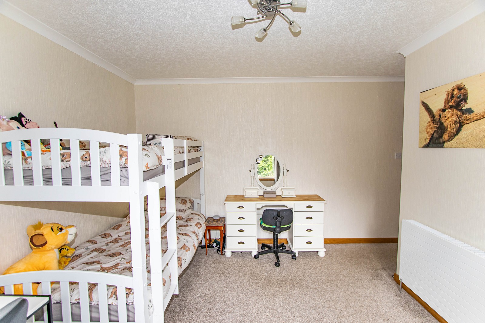 This tastefully decorated room has been wallpapered and benefits from a cupboard as well as a built-in wardrobe. A carpet has been laid to the floor; there is a modern light fitting and a window with blinds to the side elevation.