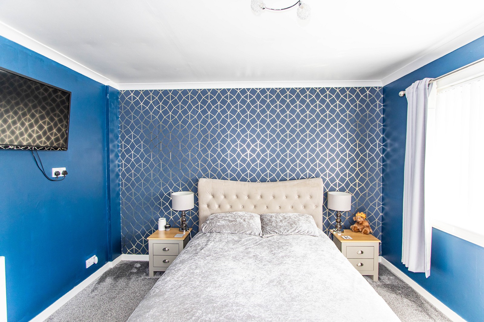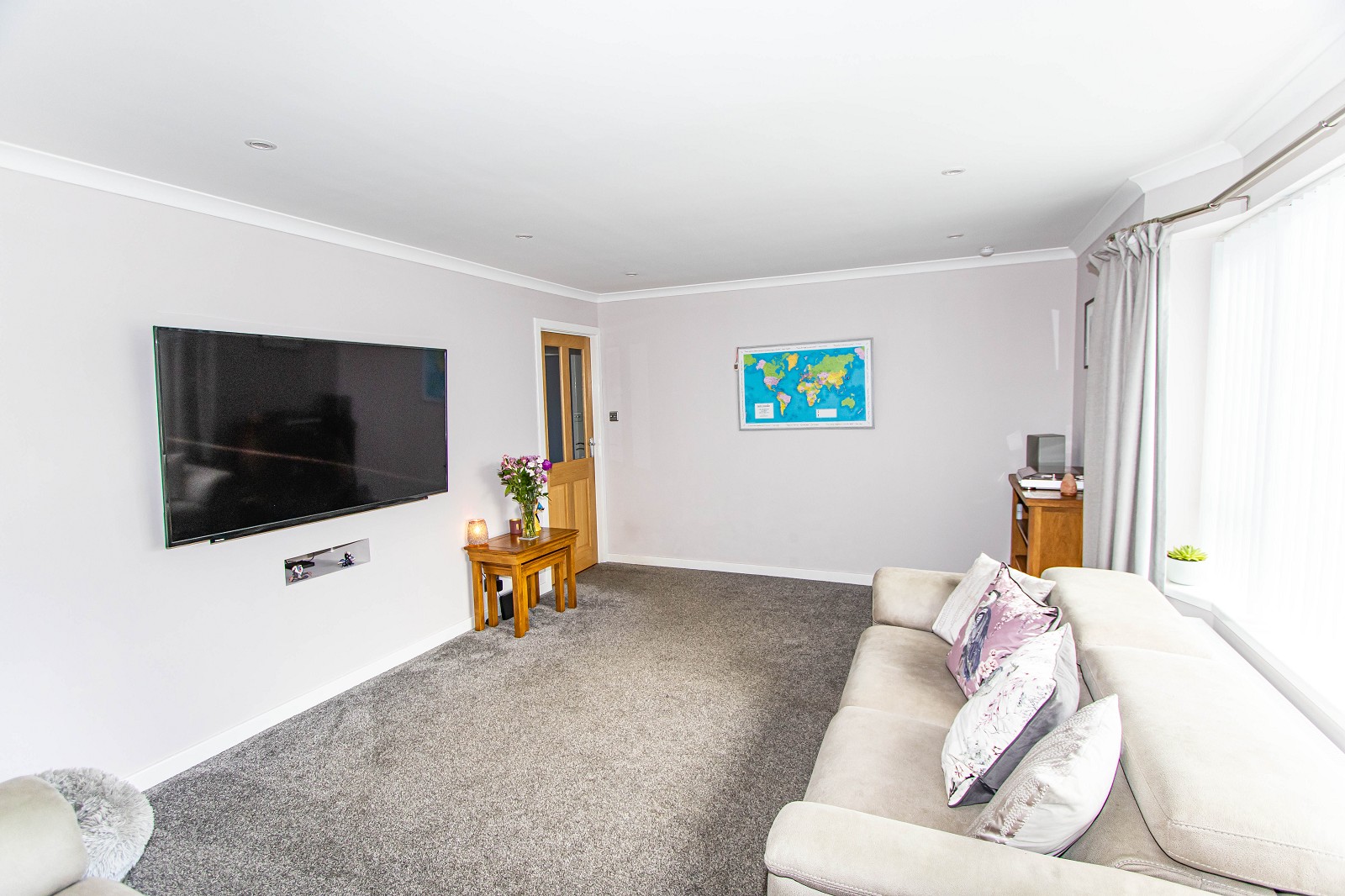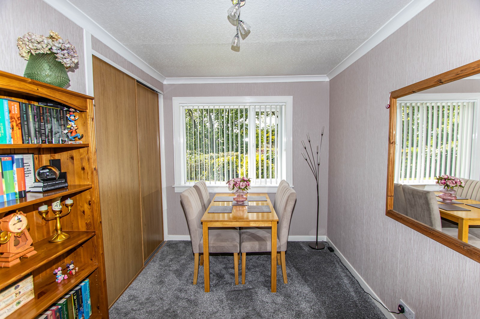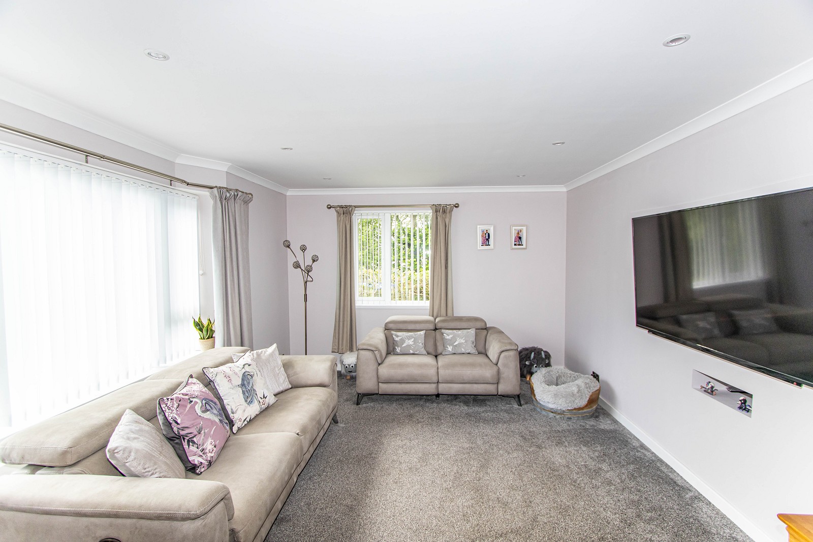 The beautiful room features dual aspect windows with blinds and a grey fitted carpet. The walls have been painted grey and there is also coving, ceiling downlighters and chrome electrical sockets.