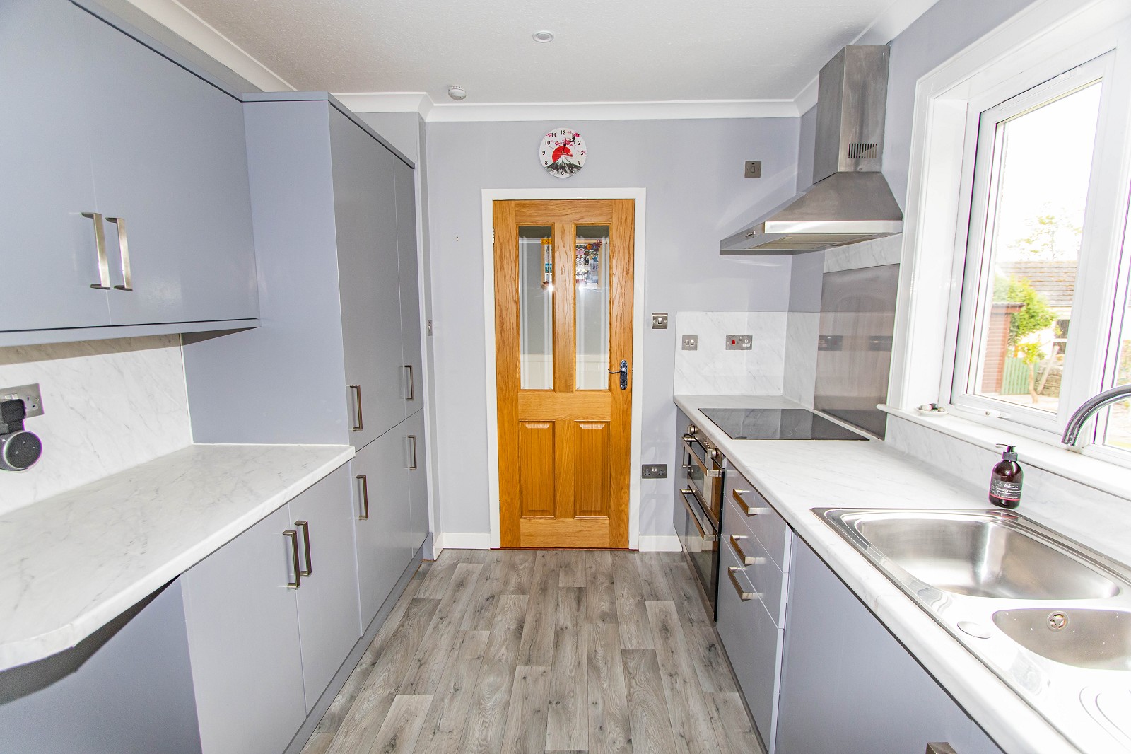 This fantastic room is light and bright and benefits from grey base and wall units with laminate worktops. There is an integral dishwasher and fridge freezer as well as a single oven and ceramic hob with a chimney extractor above. This beautiful room also benefits from a stainless-steel sink with a drainer, ceiling downlighters and has a window to the rear elevation. Vinyl has been laid to the floor and a door gives access to the rear hall.