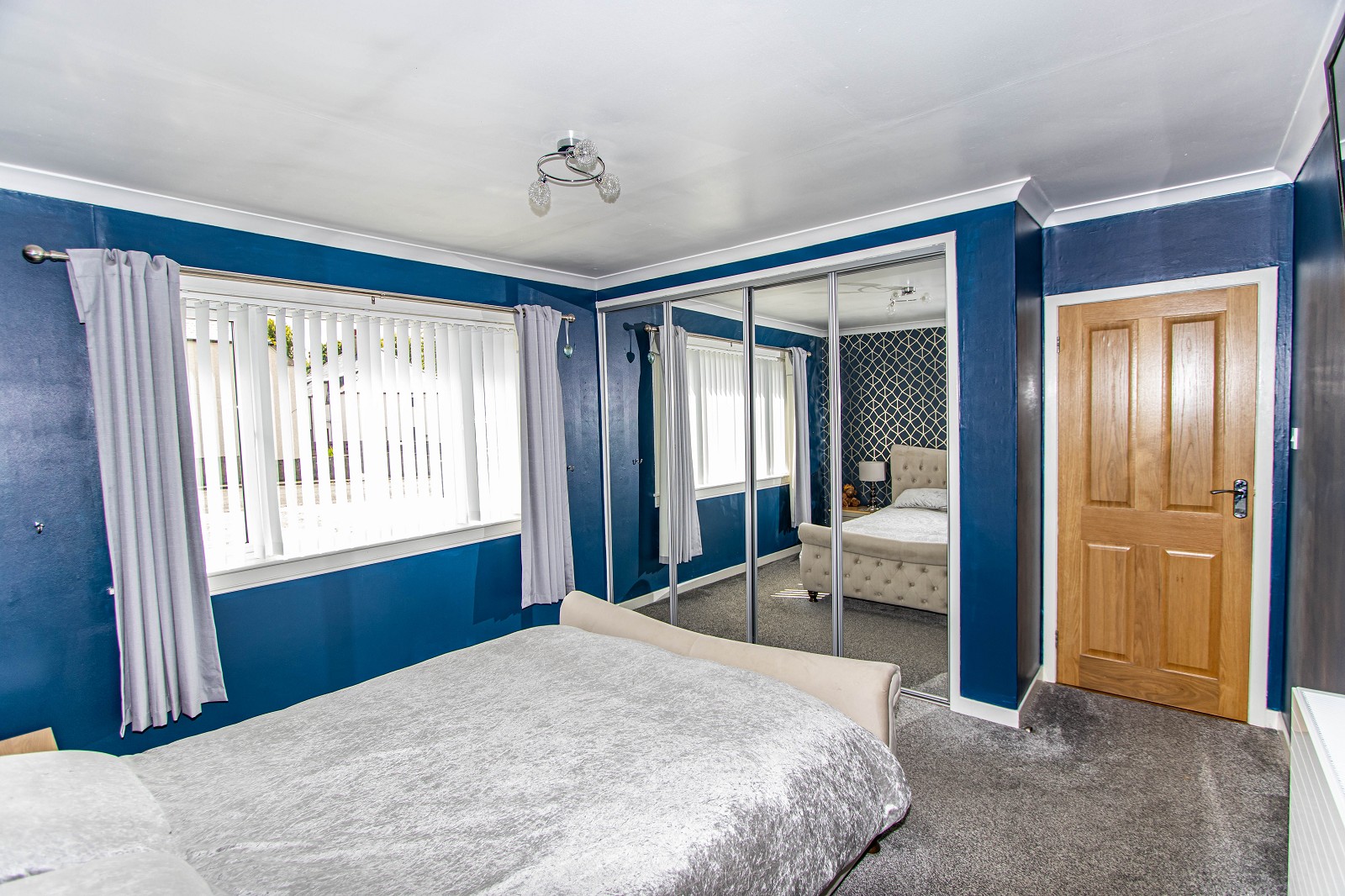 The stunning master bedroom has a feature papered wall and a grey fitted carpet. Mirrored fitted wardrobes provide hanging and shelf space. This wonderful room benefits from coving, a central heating radiator as well as a window which has been dressed with blinds which faces the front elevation. There is also a chrome triple light fitting.