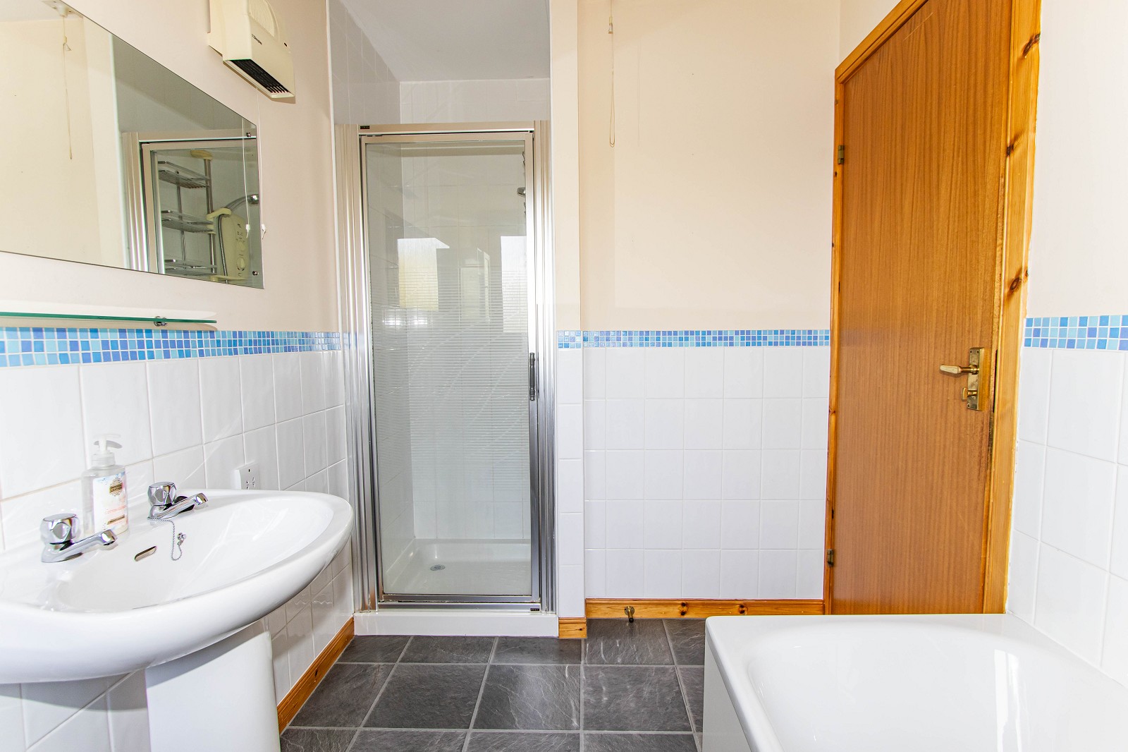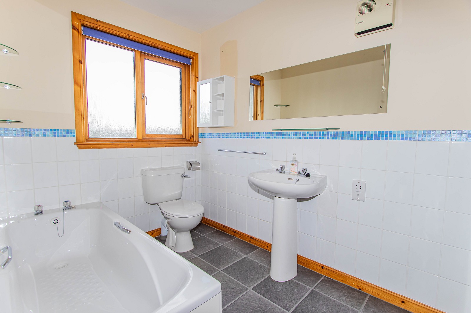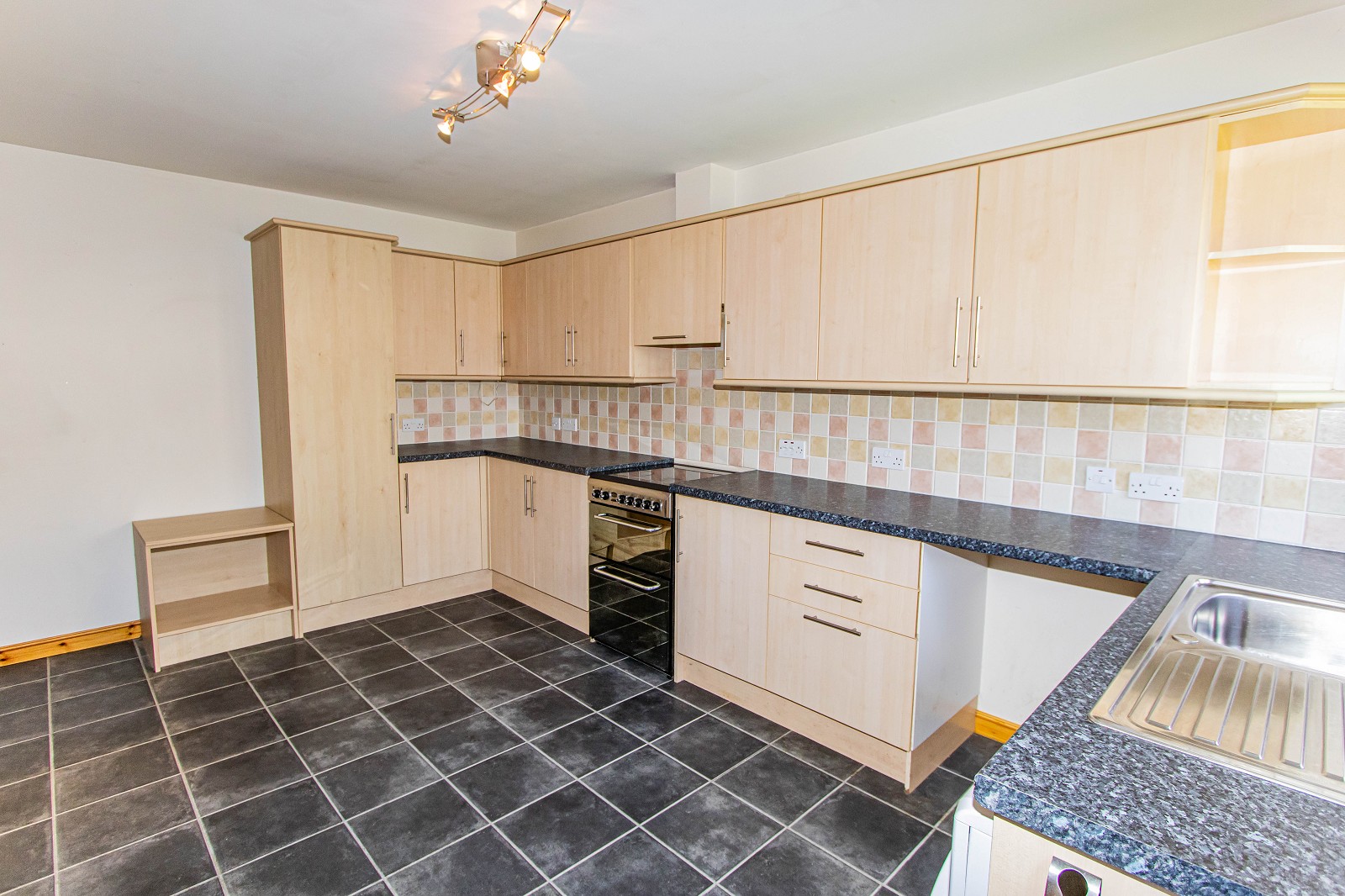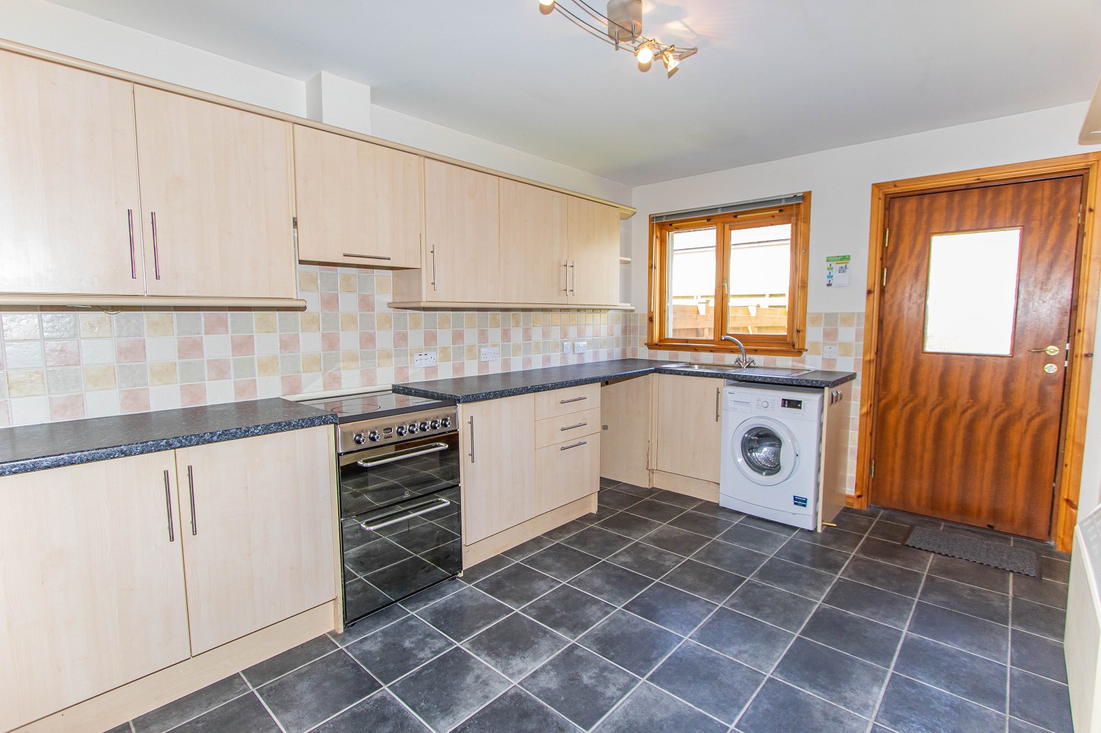 The well-equipped kitchen is of good proportions and benefits from maple base, wall and full height units with laminate worktops. Between the units has been tiled. The kitchen benefits from a freestanding cooker with an extractor above, with space for a washing machine, dishwasher and fridge freezer. Laminate tiles have been laid to the floor and there is also a stainless-steel sink with a drainer. This room has ample power points, chrome lighting and wall mounted shelving. A window faces the rear elevation and a partially glazed hardwood door leads outside. There is also a storage heater.