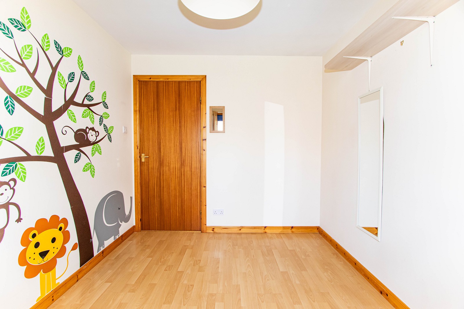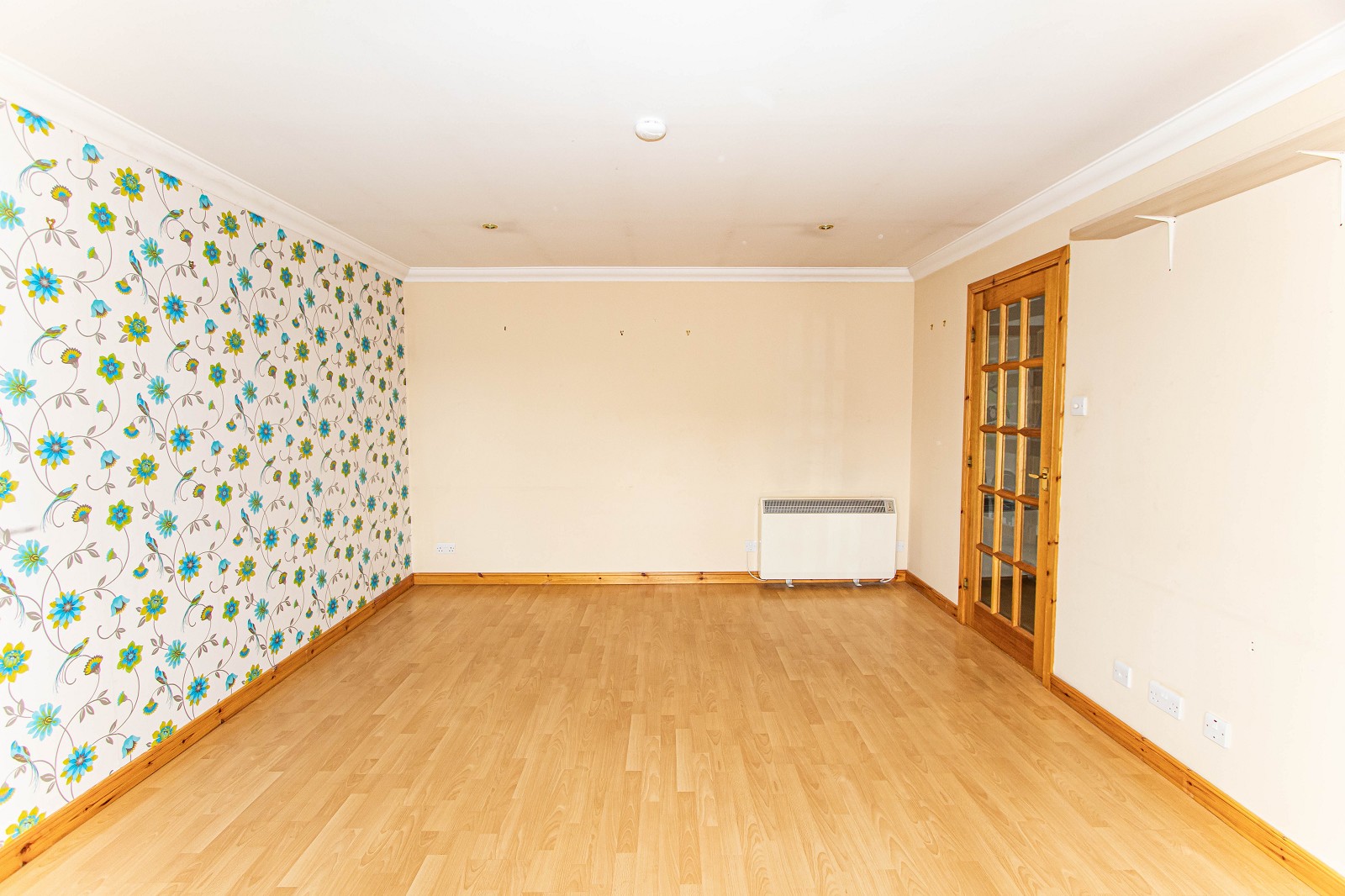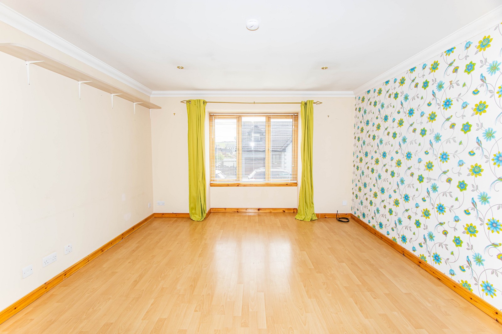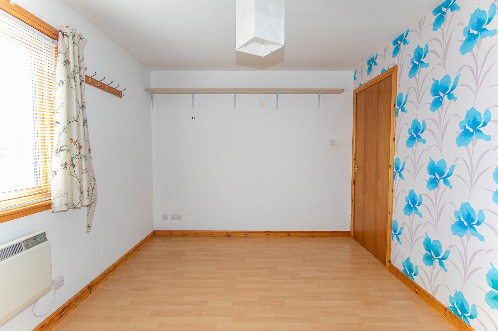 This attractive room has a feature mural wall and laminate flooring. There is an electric panel heater, double sockets and a pendant light fitting. A window with curtains enjoys an outlook of the generous rear garden.