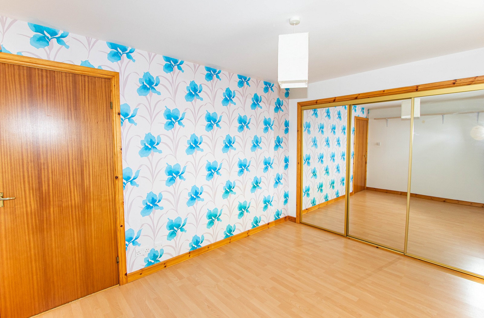 Located to the front of this wonderful home, this bright and airy double room has a feature papered wall and benefits from oak laminate flooring. There are triple mirrored built in wardrobes with hanging and shelf space, an electric panel heater as well as a phone point and double sockets. The window has been dressed with both blinds and curtains and there is also a pendant light fitting.