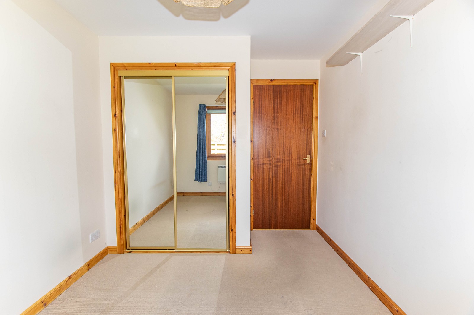 Neutral in décor, this bright double bedroom benefits from a window with curtains as well as a panel heater. A carpet has been laid to the floor. There is a pendant light fitting, double sockets and a built-in mirrored wardrobe with hanging and shelf space.