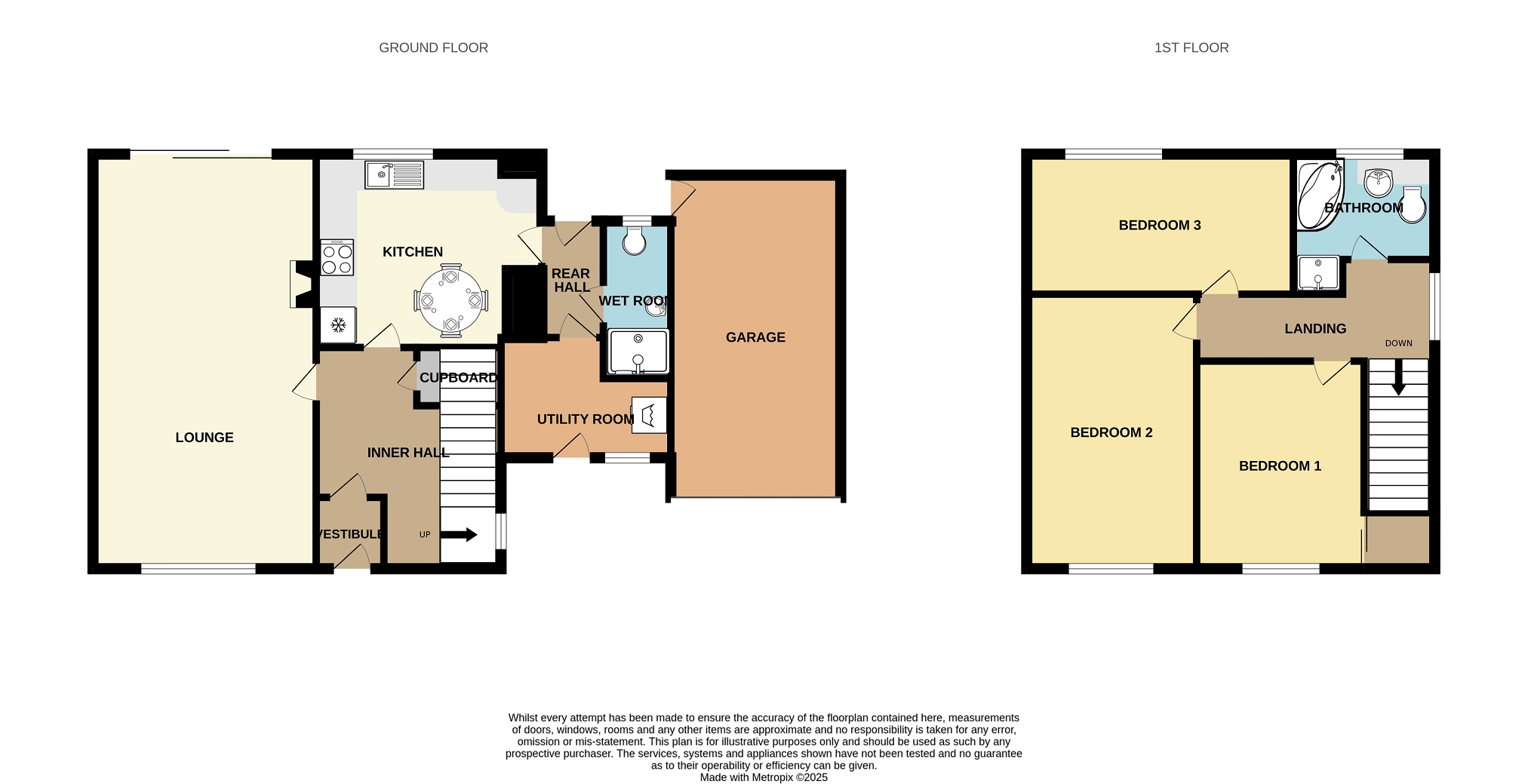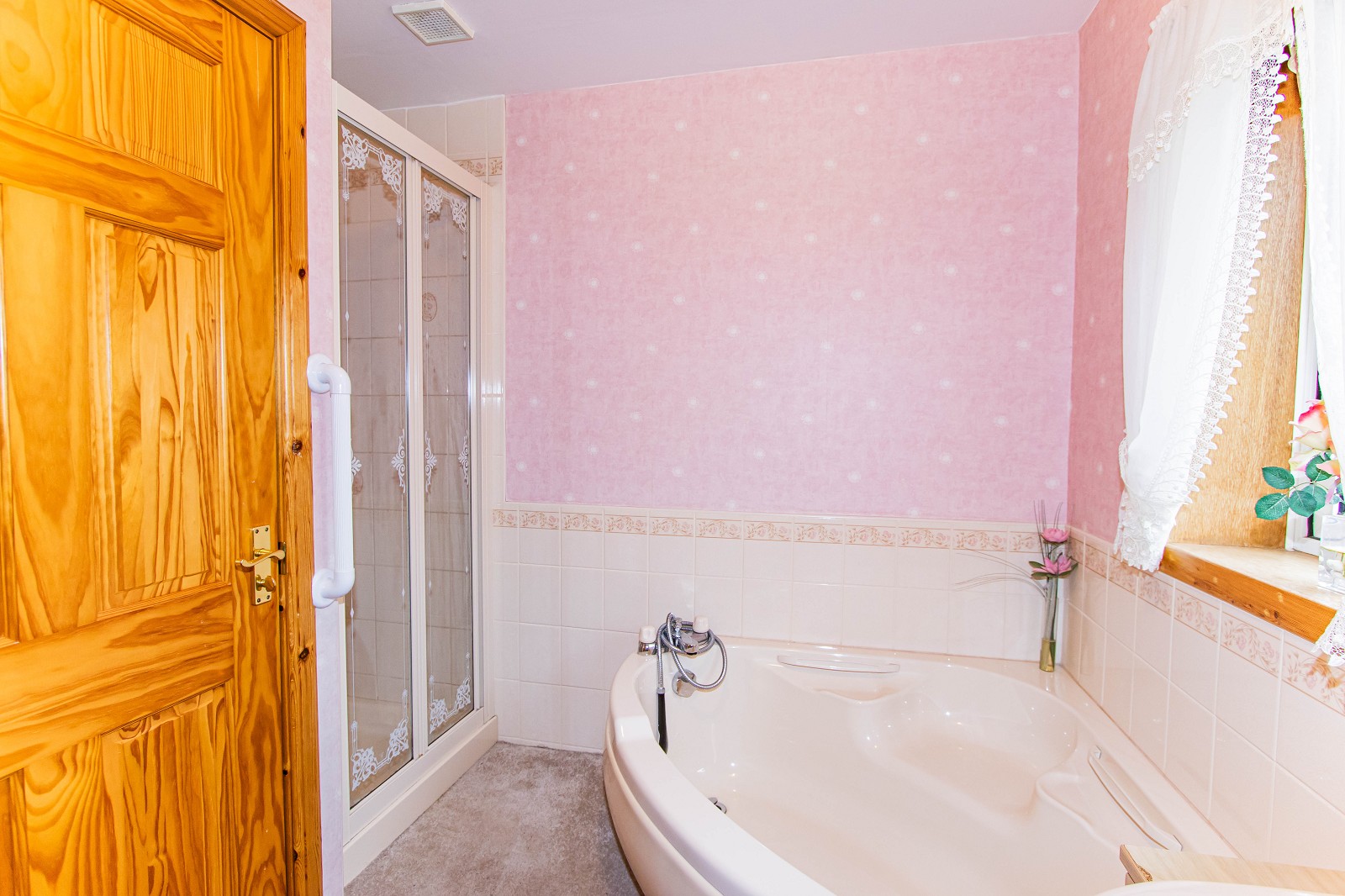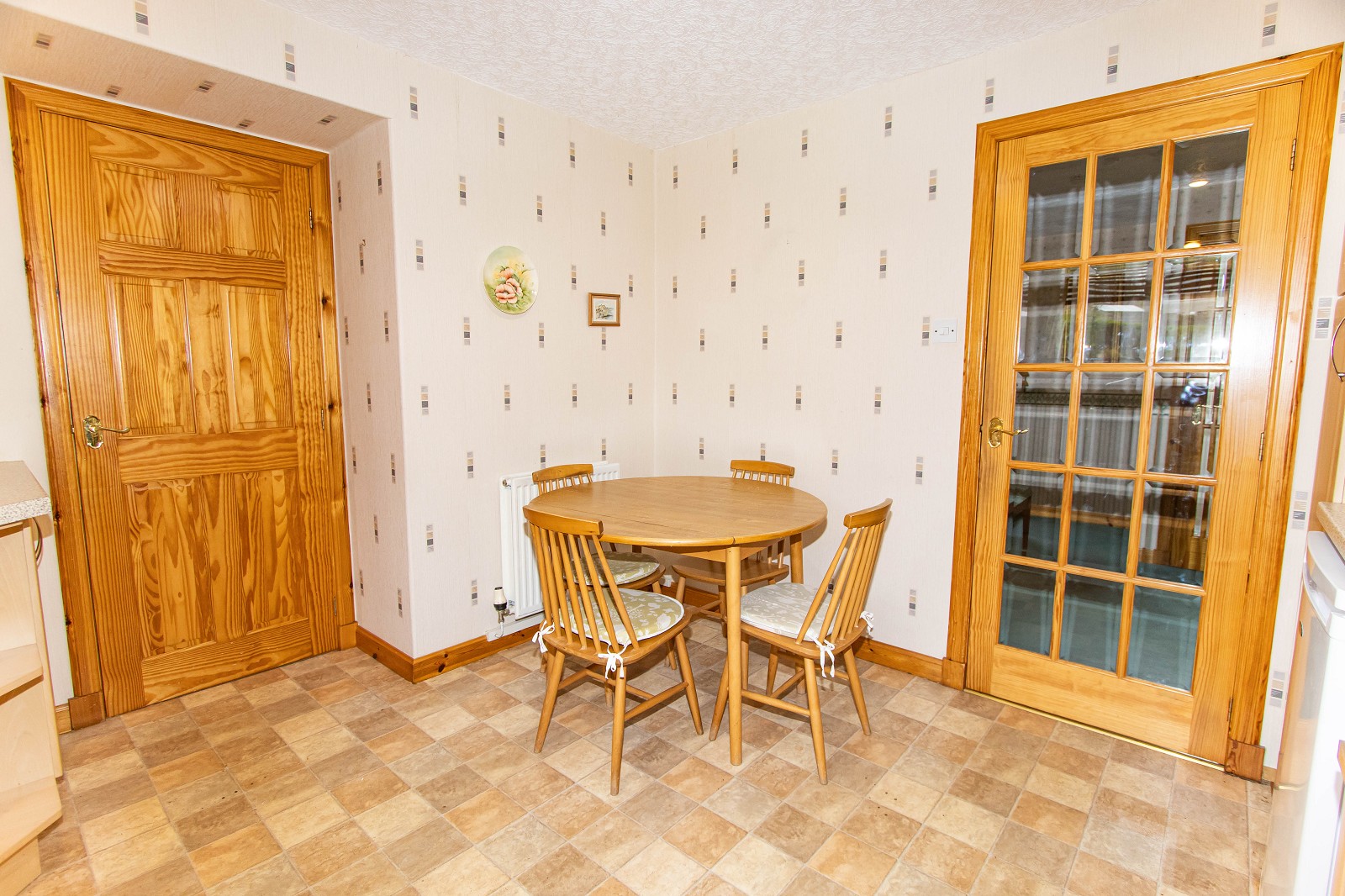The rear hall has been wallpapered and benefits from ceramic floor tiles. There is also a light fitting. Doors give access to the wet room and utility. A UPVC door leads to the rear garden.