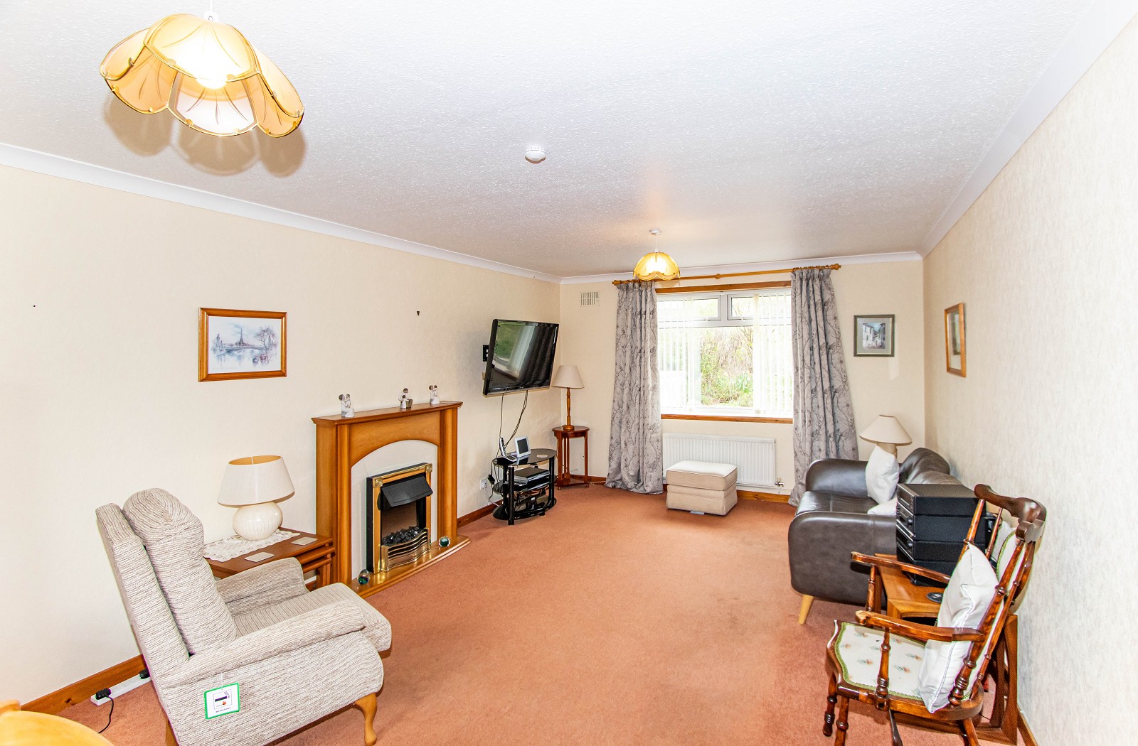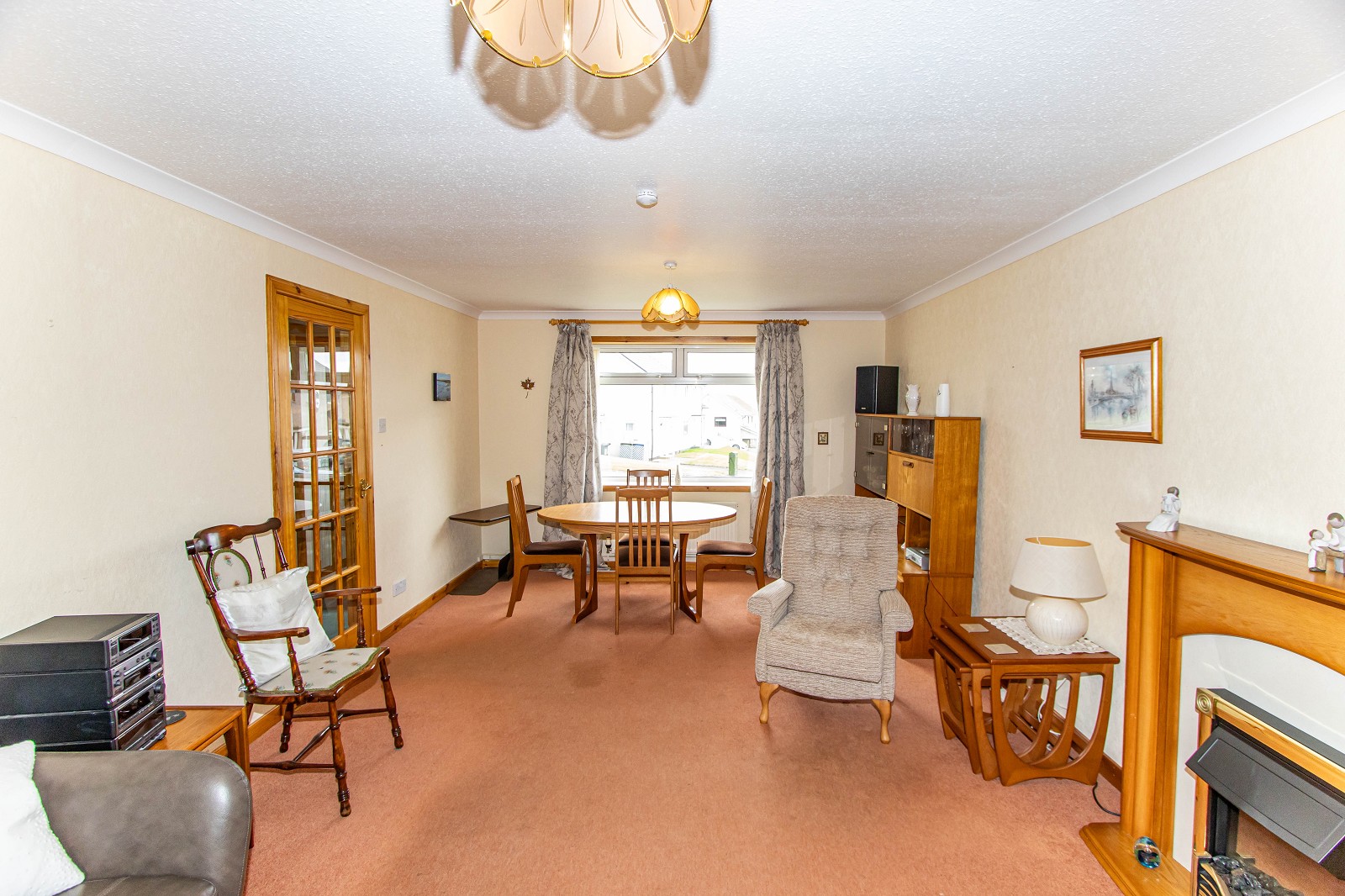 This beautiful room is neutral in décor and benefits from magnolia painted walls as well as a fitted carpet. A focal point within this spacious room is the attractive wooden fireplace with insert gas fire. There are two pendant light fittings as well as central heating radiators. Two dual aspect windows which are dressed with blinds and curtains make this an exceptionally bright and welcoming reception room. The lounge also benefits from coving and ample power points.