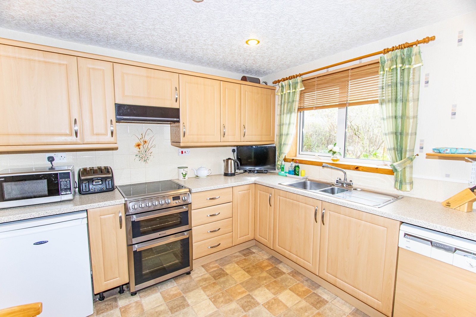 The immaculate kitchen benefits from an excellent selection of maple base and wall units with laminate worktops. There is a freestanding cooker with an extractor above, a stainless-steel sink with a drainer as well as an integral dishwasher with an under-counter fridge. Vinyl has been laid to the floor and there is also a central heating radiator. Space can be found for a dining table and chairs. A window with blinds and curtains faces the rear elevation. There is an extractor fan and wall mounted shelving. A door gives access to the rear hall.