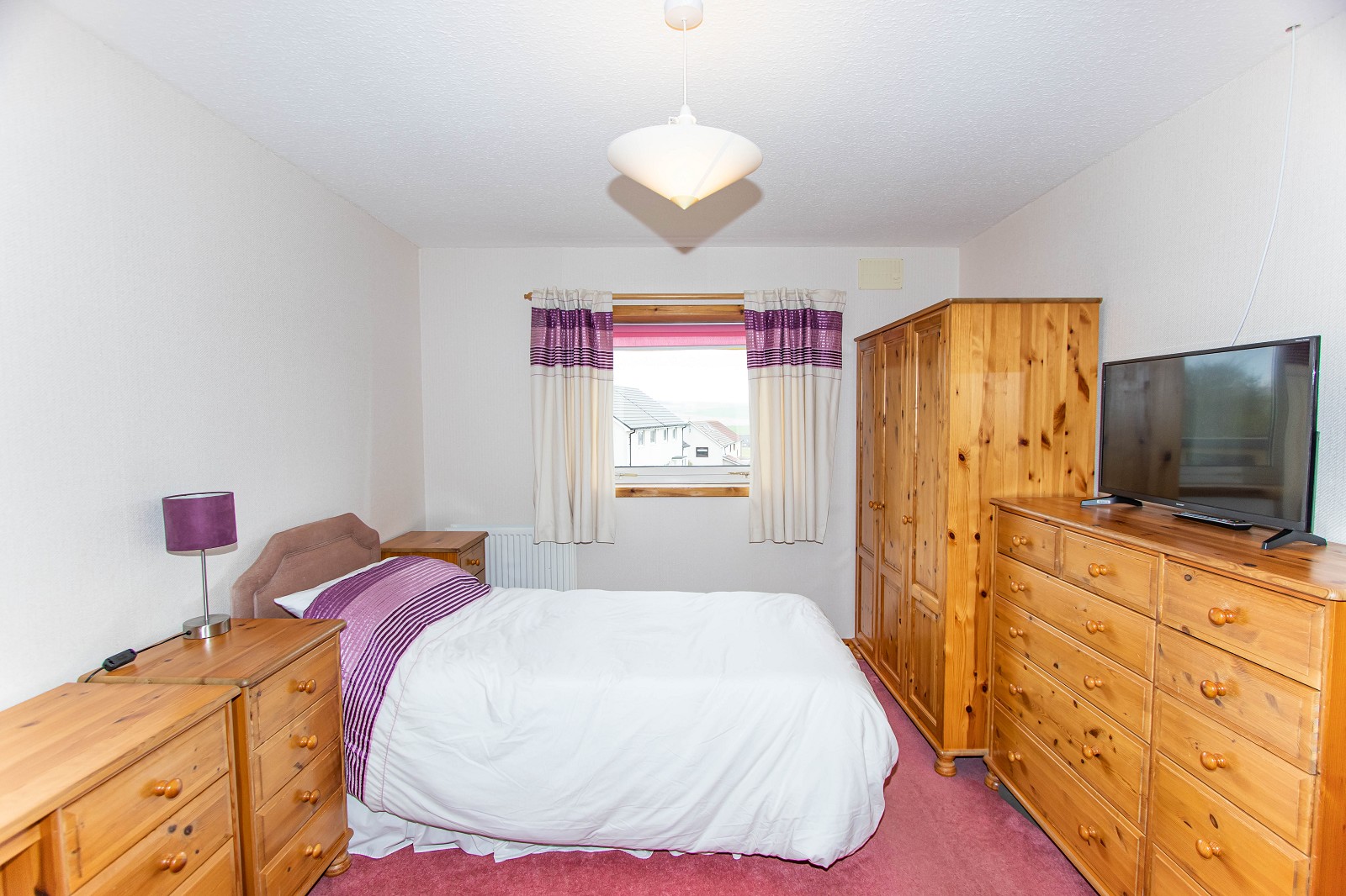 This beautiful room has white painted walls and a beige fitted carpet. There are built in wardrobes with hanging and shelf space. A window with curtains faces the front elevation, there is also a pendant light fitting, a radiator and double sockets.