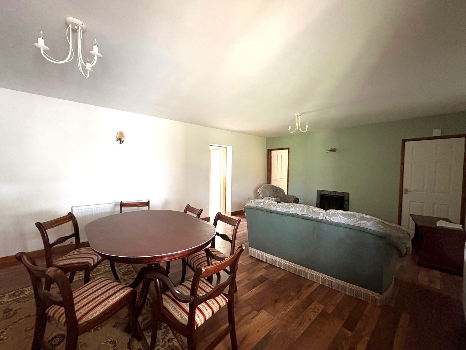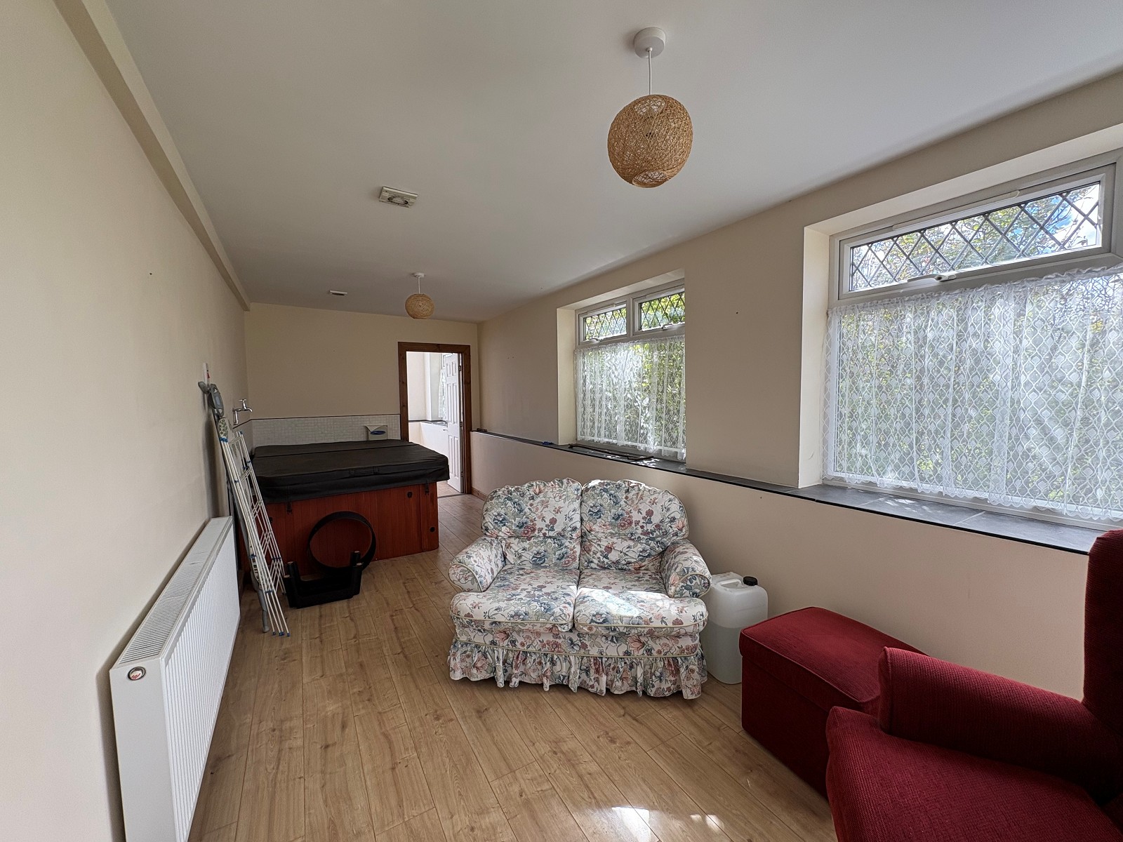 This large room has a closed-in fire set on a tiled hearth with surround. There is a cupboard housing pipe work. The flooring is laid to laminate and there are two radiators to the wall. Double doors lead into a sun room and another door leads into the kitchen. There is a hatch to the attic space.
