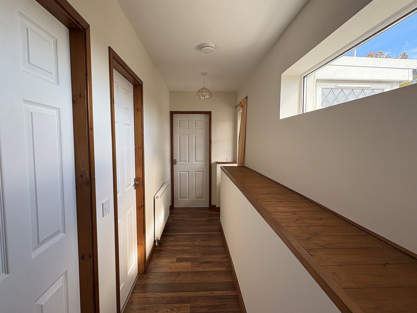 The hallway has a window facing to the front and there is a long built-in shelf which has a small cupboard beneath that houses the electrics. There is also a built-in shelved cupboard. A hatch leads to the attic space. The flooring is laid to laminate and there are two radiators to the walls.