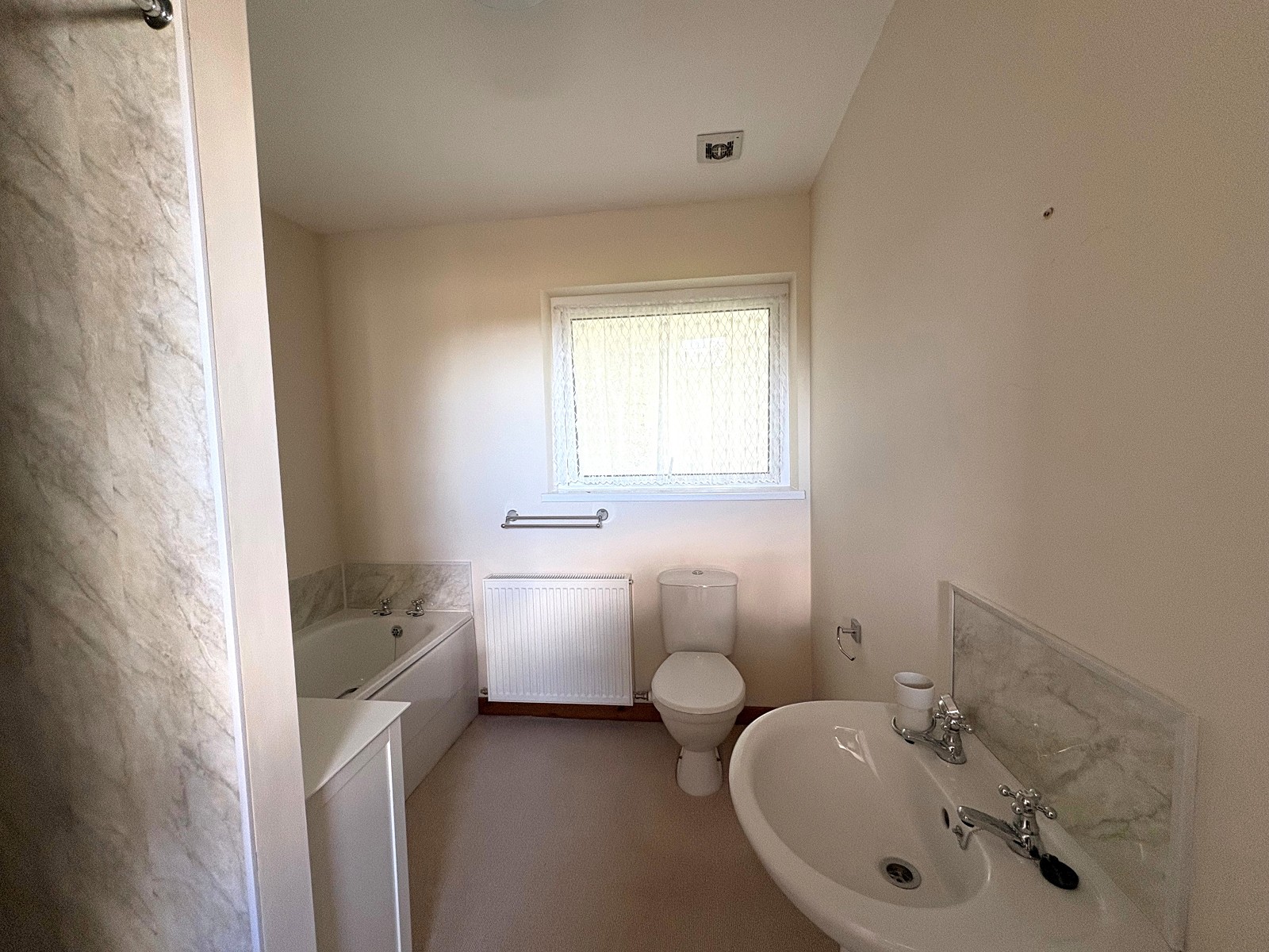 There is a bath, W.C. and handbasin, also a large built-in shower tray with wet wall surround and Triton shower to the wall. An opaque window faces to the rear vestibule, the flooring is laid to carpet and there is a radiator to the wall.