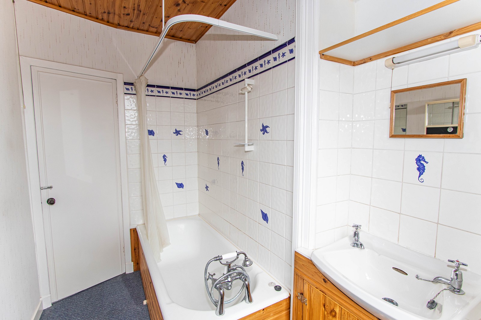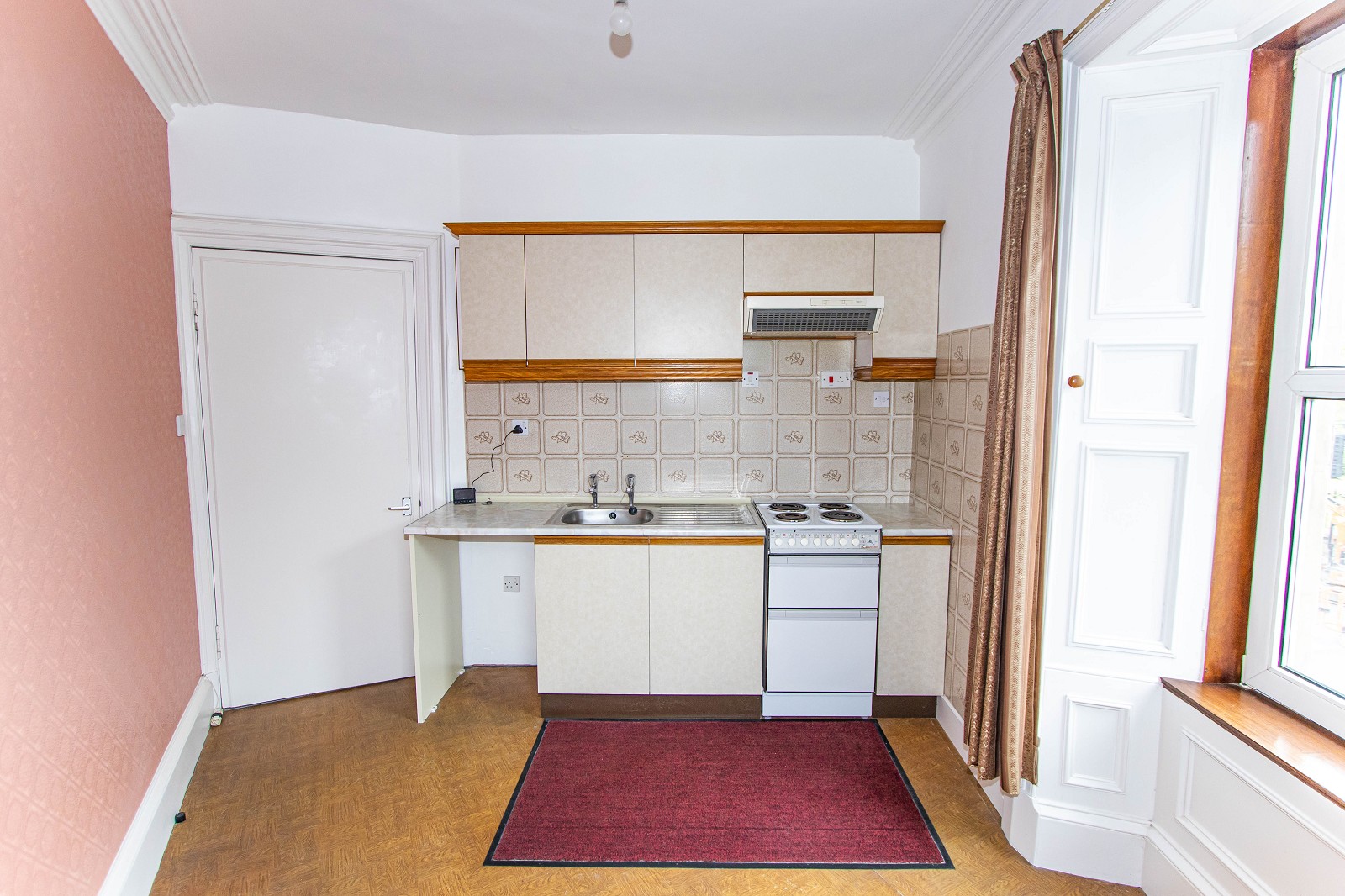 The kitchen is bright with dual aspect windows which have attractive wooden panelling. There are base units with laminate worktops as well as a stainless-steel sink with a drainer. The kitchen also benefits from an extractor hood, a freestanding cooker and has space for a washing machine and fridge freezer. Vinyl has been laid to the floor, there is a smoke alarm, double sockets and lighting.