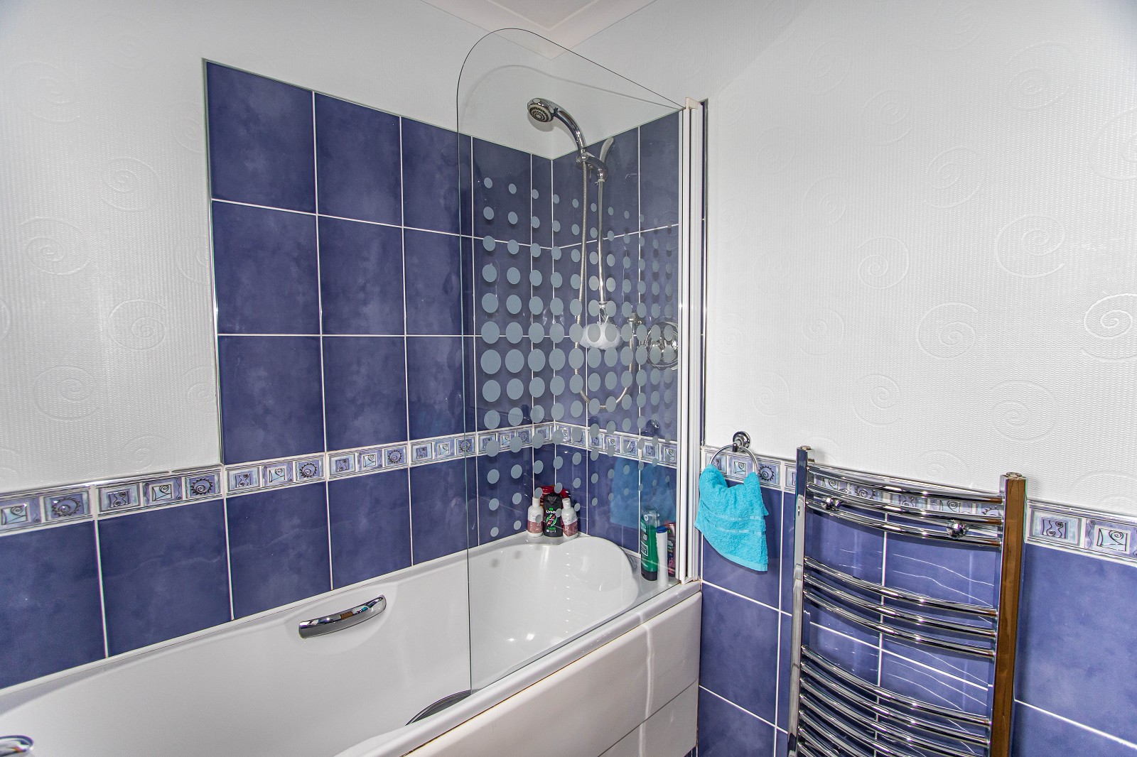 The bathroom benefits from a white pedestal sink, WC and bath with shower above as well as a glass shower screen. Ceramic tiles have been laid to the floor and the walls have been partially tiled. There is a chrome towel ladder radiator, a pendant light fitting and coving as well as a wall mounted mirror and a window to the rear elevation.