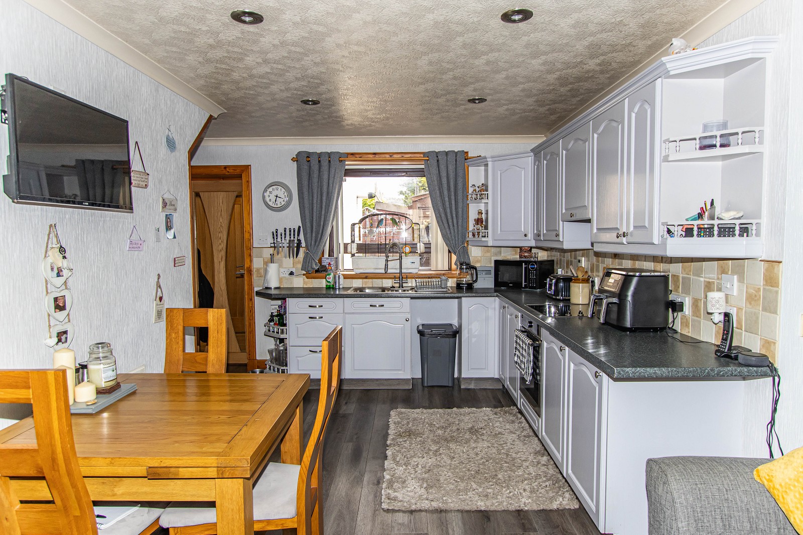The immaculately presented kitchen benefits from a good selection of white wall and base units with laminate worktops. Between the units have been tiled and there is an integral hob and oven as well as two central heating radiators, ceiling downlighters and coving. Windows can be found to the front and rear of the property and there is also an under-stair storage cupboard. Plenty of space can be found for a table and chairs as well as a sofa. A door leads to the rear hall.