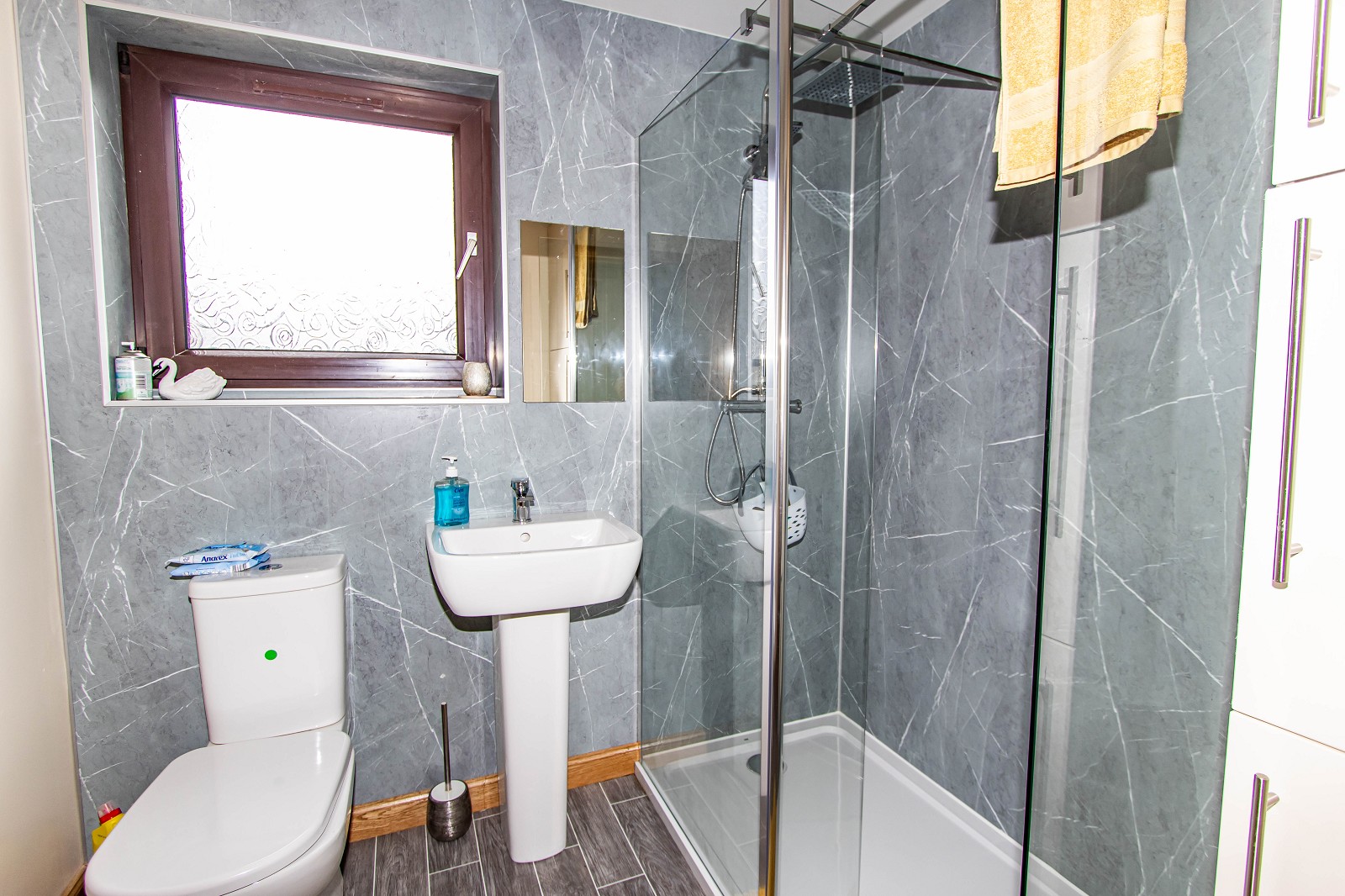 The bright, well-presented shower room benefits from a white WC, pedestal sink and shower enclosure with mixer shower. Vinyl has been laid to the floor and a window faces the side elevation. Wet wall has been partially fitted, there is a flush light fitting, a central heating radiator and a wall mounted mirror. A tall corner unit and a wall mounted cupboard provides further storage.