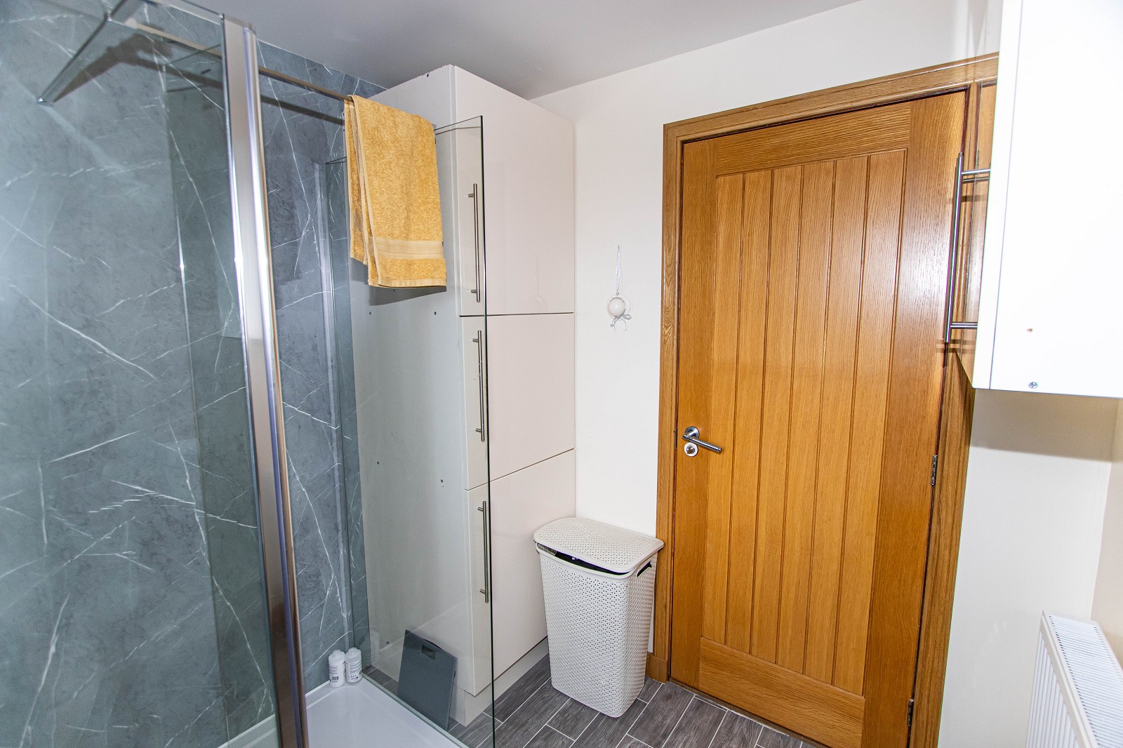 This area of the home is bright and benefits from laminate flooring. There are wall mounted cupboards as well as a base unit and laminate worktop. Space can be found for a washing machine and the central heating boiler is also housed here. There are wall mounted coat hooks, two flush light fittings and a smoke alarm as well as a central heating radiator and recessed shelves which is currently being used for shoe storage. Doors lead to the shower room, a bedroom and a UPVC door leads outside.