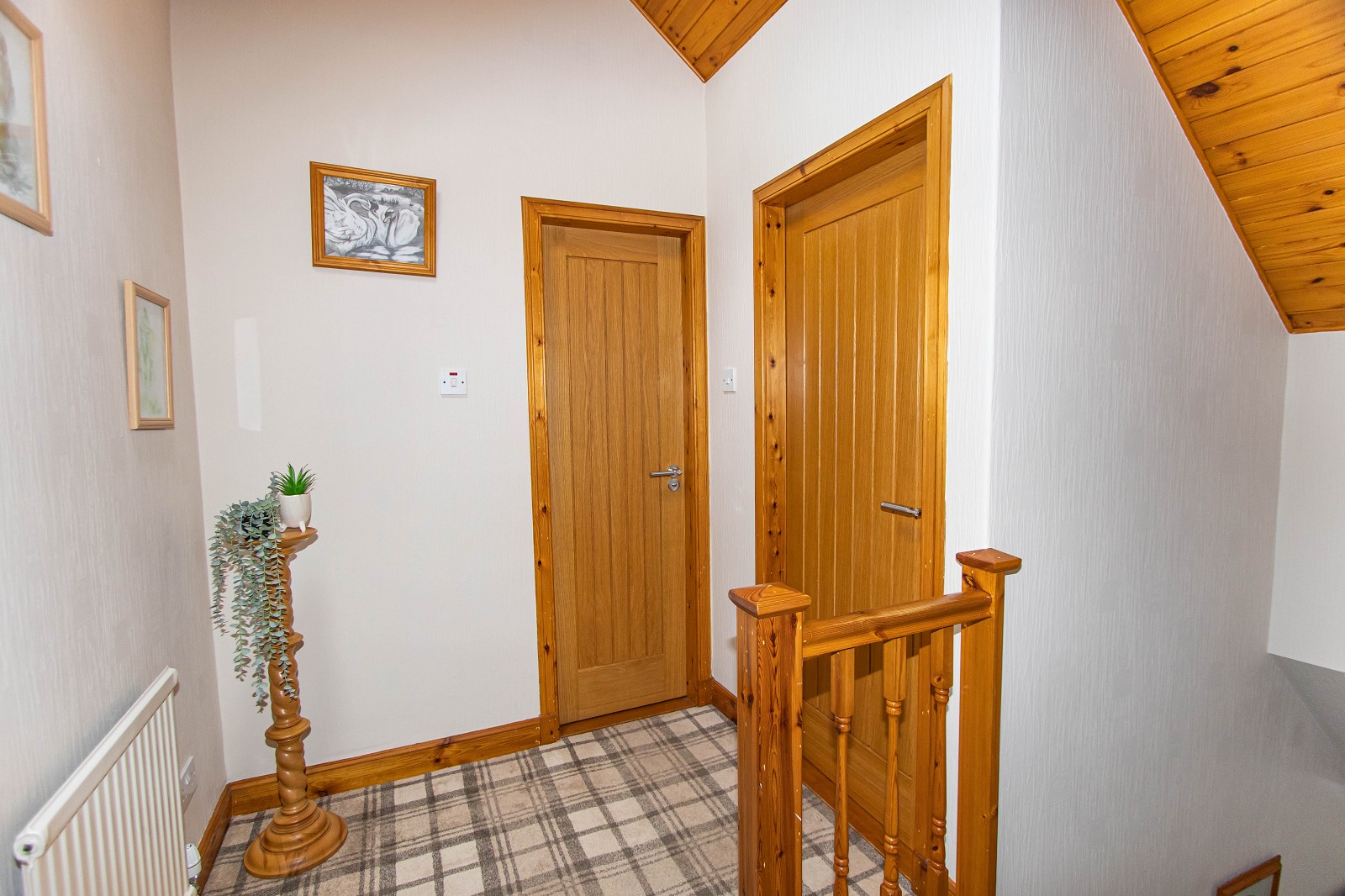 A carpeted stairwell leads to the first-floor landing and benefits from a velux window which lets in plenty of daylight. There is a smoke alarm, a central heating radiator and ceiling downlighters. Doors lead to three bedrooms and family bathroom.