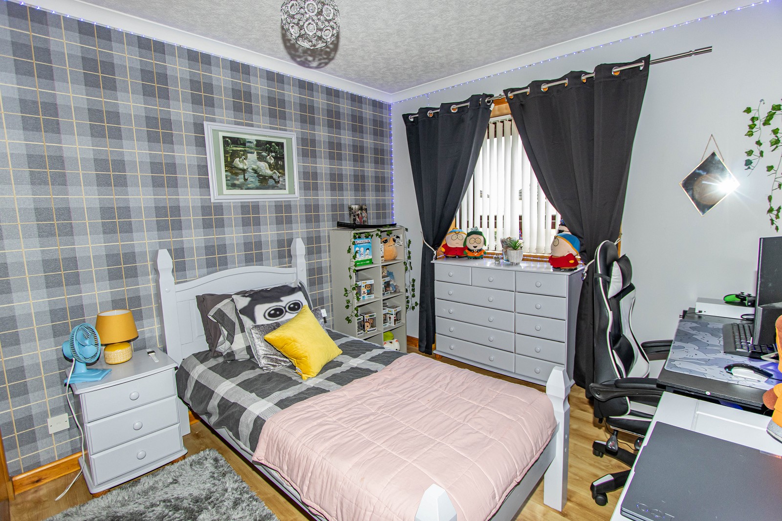 This room has a feature wall papered wall and window to the rear elevation. There is a central heating radiator, coving and double sockets. A carpet has been laid to the floor.