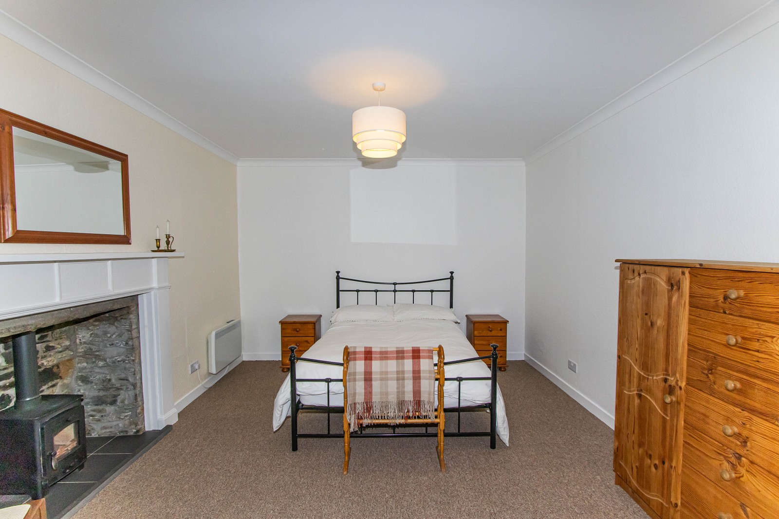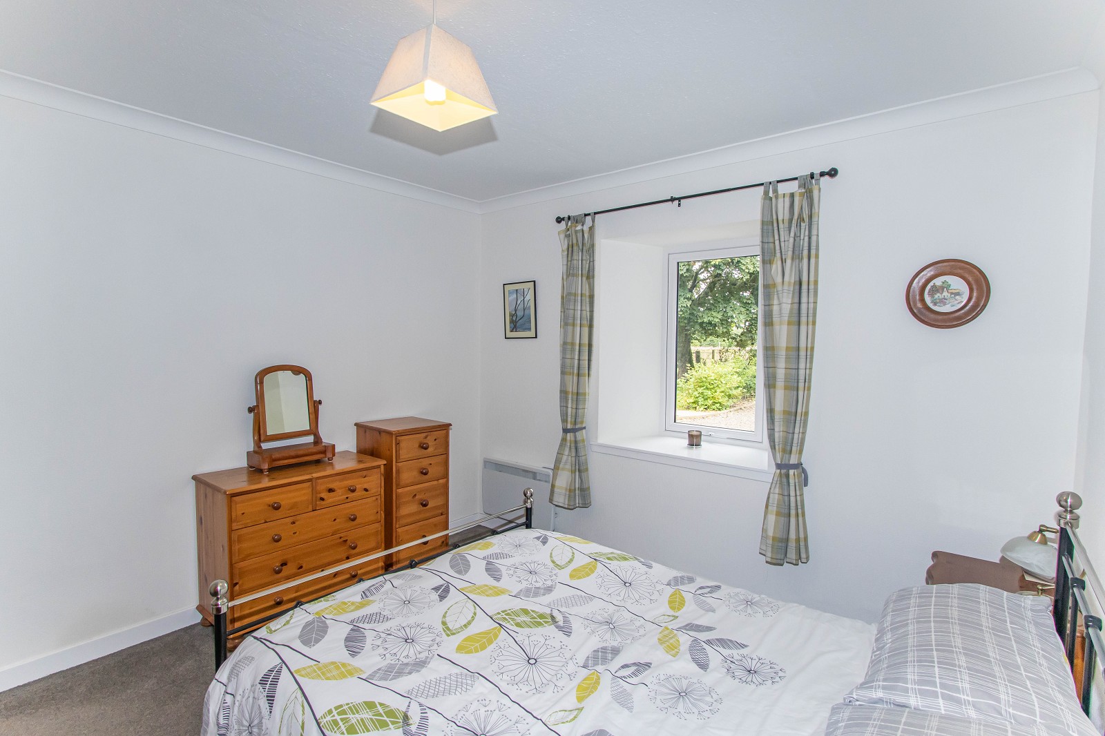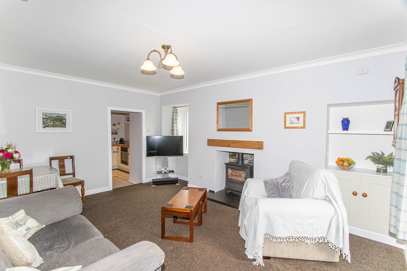 This spacious room is neutral in decor and benefits from magnolia painted walls and a beige fitted carpet. A beautiful wooden fireplace with a Caithness flagstone tiled hearth and multi fuel stove creates a focal point within the room. There is a wall-mounted heater, coving and a pendant light fitting. A window faces the front elevation and enjoys an outlook over the tranquil garden grounds.