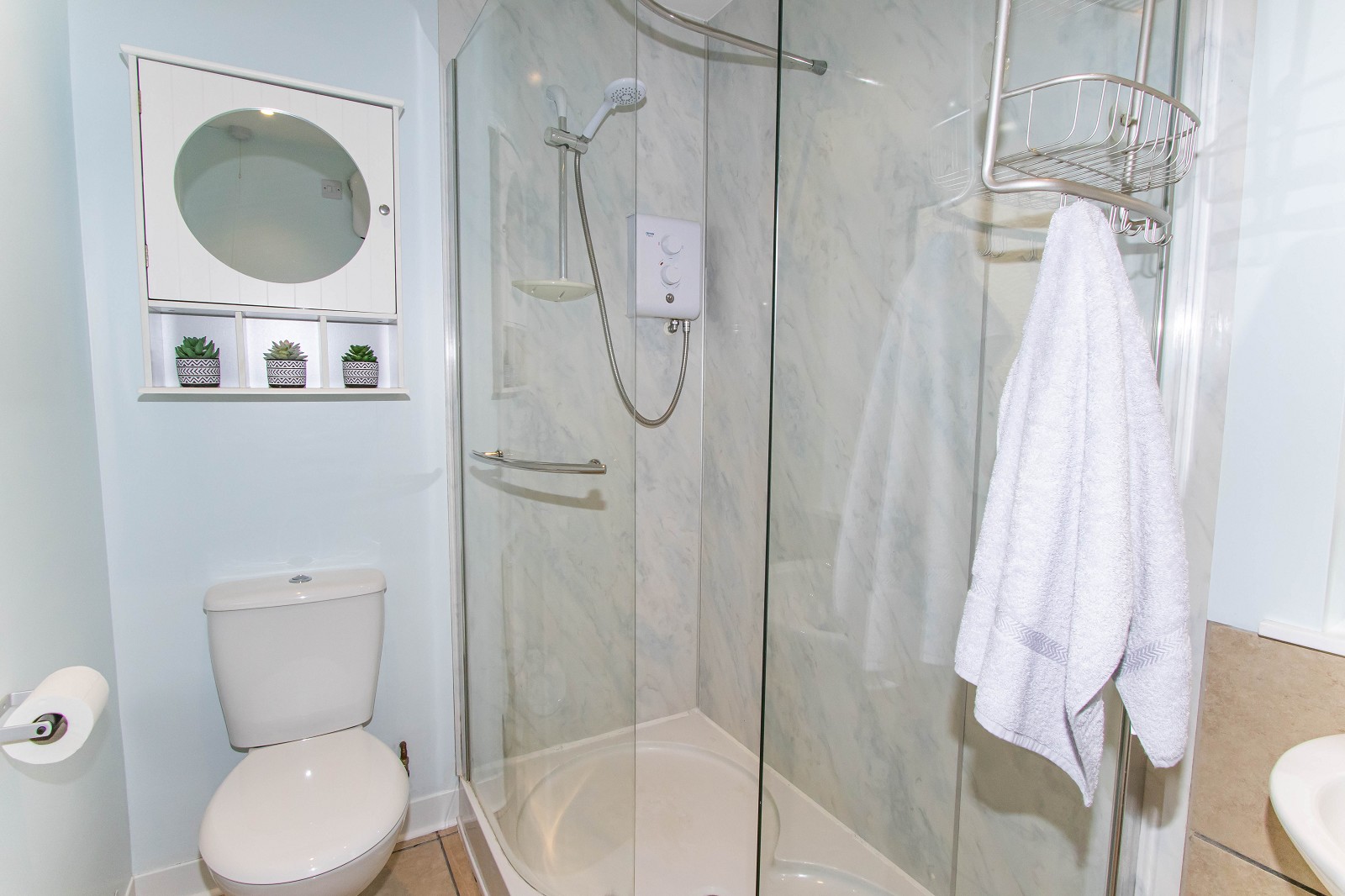 The shower room features a generous glass shower cubicle with a Tritan shower unit. Ceramic tiles have been laid to the floor. There is a white WC, a pedestal sink as well as a wall mounted cupboard. This room benefits from a heater, ceiling down lighters and has an opaque window to the rear elevation.