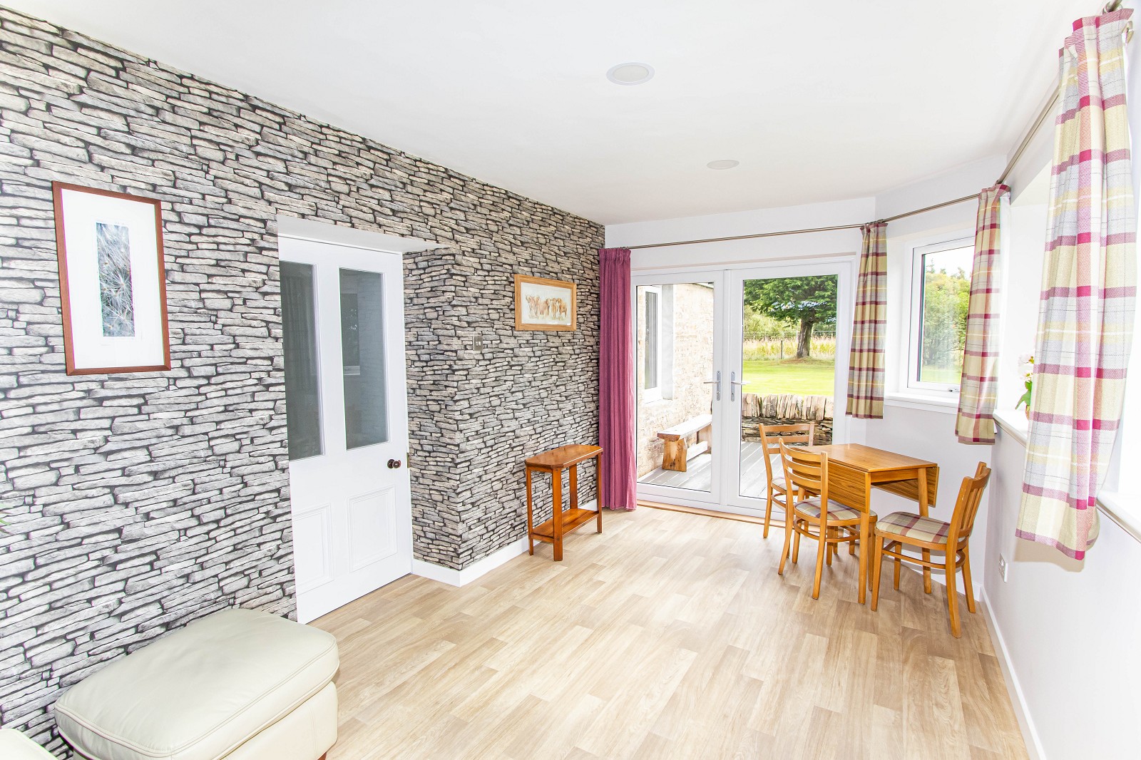 This beautiful room benefits from grey painted walls and a recessed shelved alcove with built-in cupboard space underneath. A focal point within the room is the oak mantel as well as the multi-fuel stove which sits on a Caithness Flagstone hearth. There are double sockets, coving and a smoke alarm. The room also benefits from a triple light fitting and dual aspect windows with curtains, one of which benefits from a window seat.