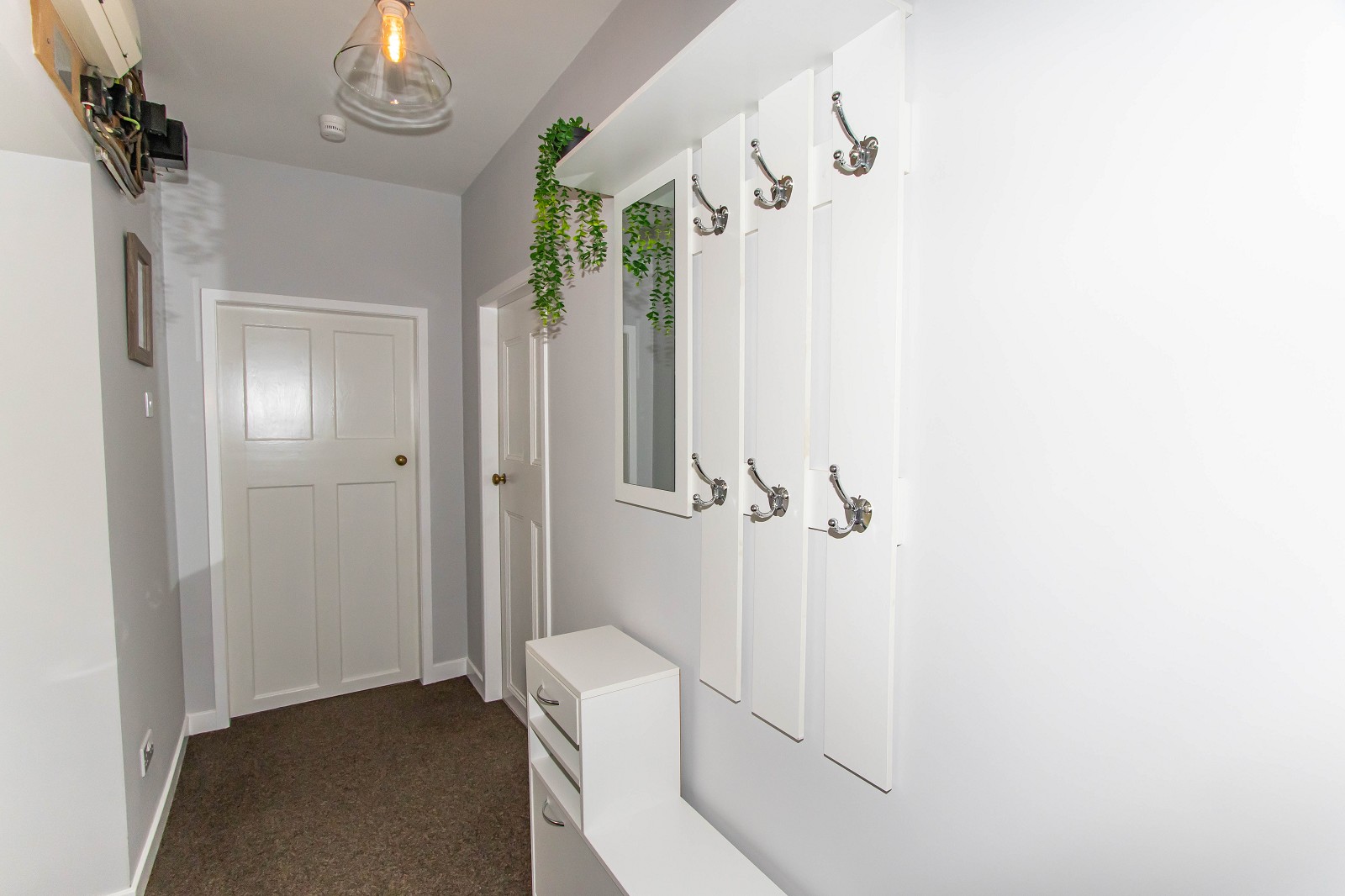 The hallway benefits from grey painted walls and a fitted carpet. There is an access hatch leading to the loft void and double sockets. There is a drop-down light fitting. Doors lead to the lounge, sun-room and two bedrooms.