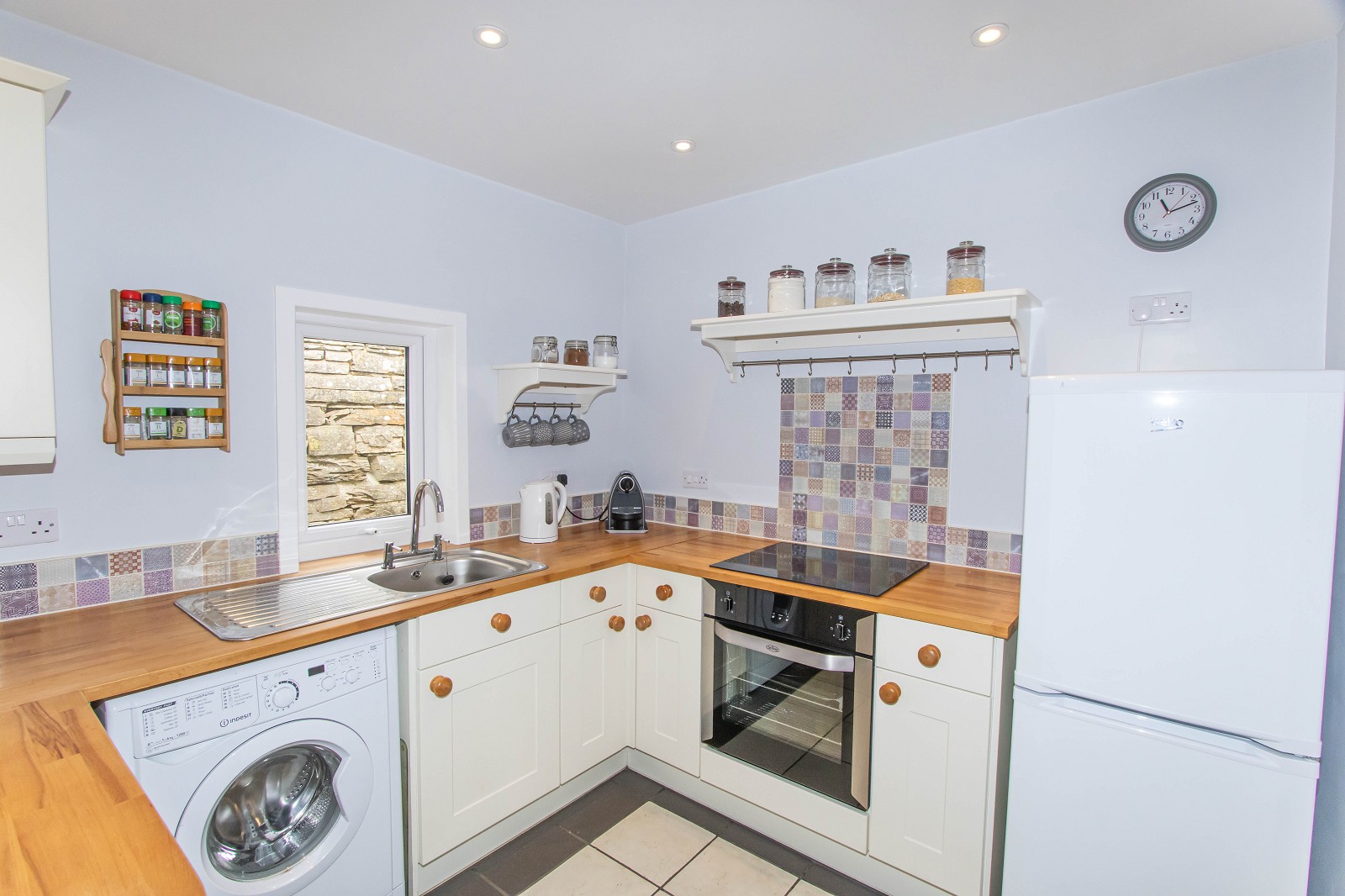 This lovely room benefits from cream base and wall units with oak worktops. There is a ceramic hob, a single oven and space for a washing machine and fridge-freezer. A stainless-steel sink with a drainer faces the rear elevation and ceramic tiles are laid to the floor. There is a plinth-mounted electric heater in this room. The kitchen also benefits from down lighters, wall mounted shelving and tiled splash-backs. A door gives access to the rear hall.